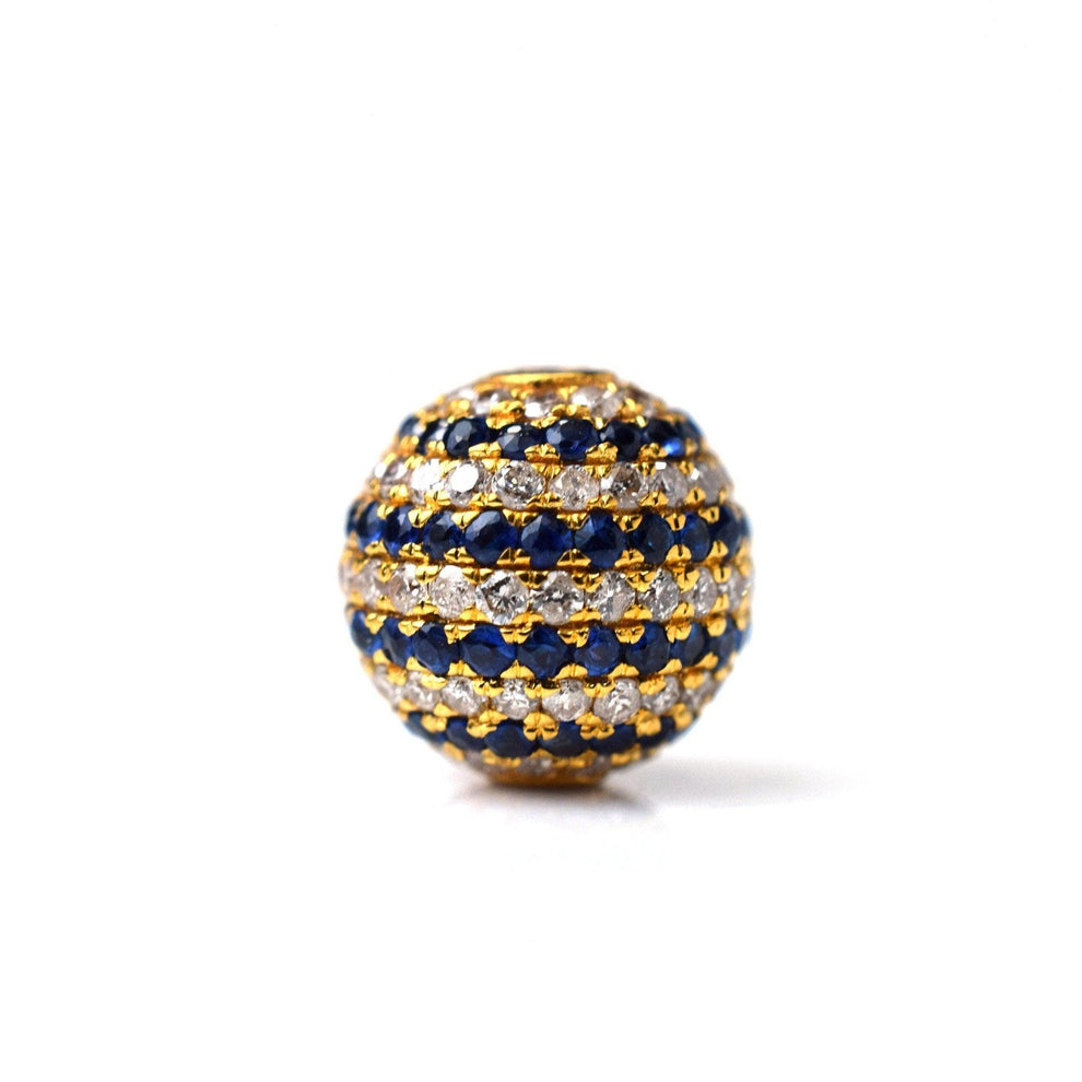 14k Solid Yellow Gold Pave Diamond & Blue Sapphire Round Beads 8mm