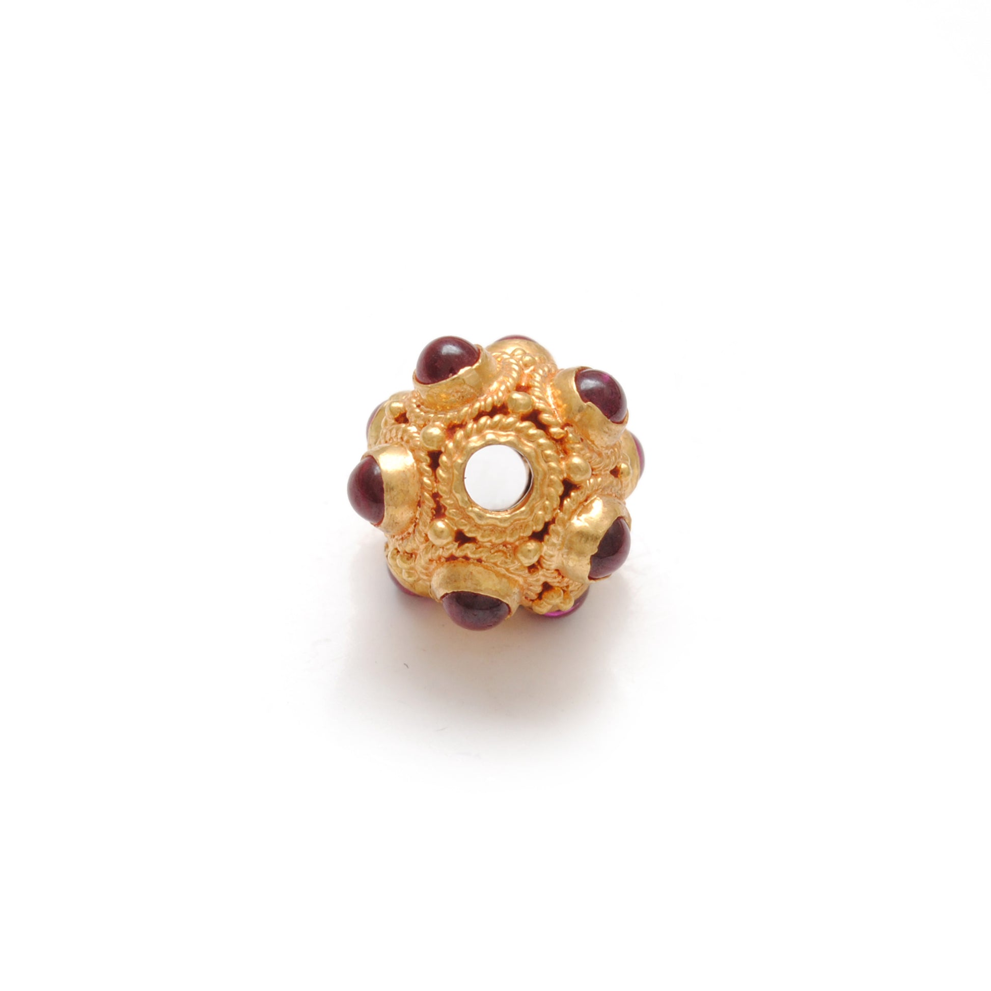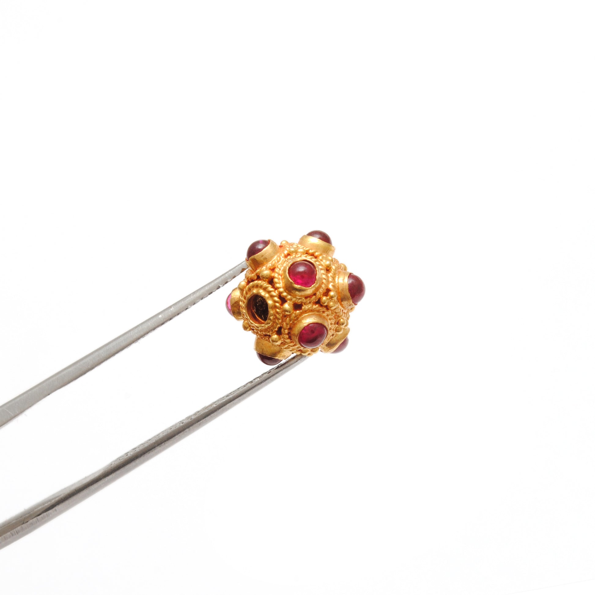 Experience luxury and sophistication with our 9mm 18k Solid Gold Studded With Ruby stone Ball Bead. Crafted with precision, this stunning jewelry piece features a brilliant ruby stone that adds a touch of elegance to any outfit.