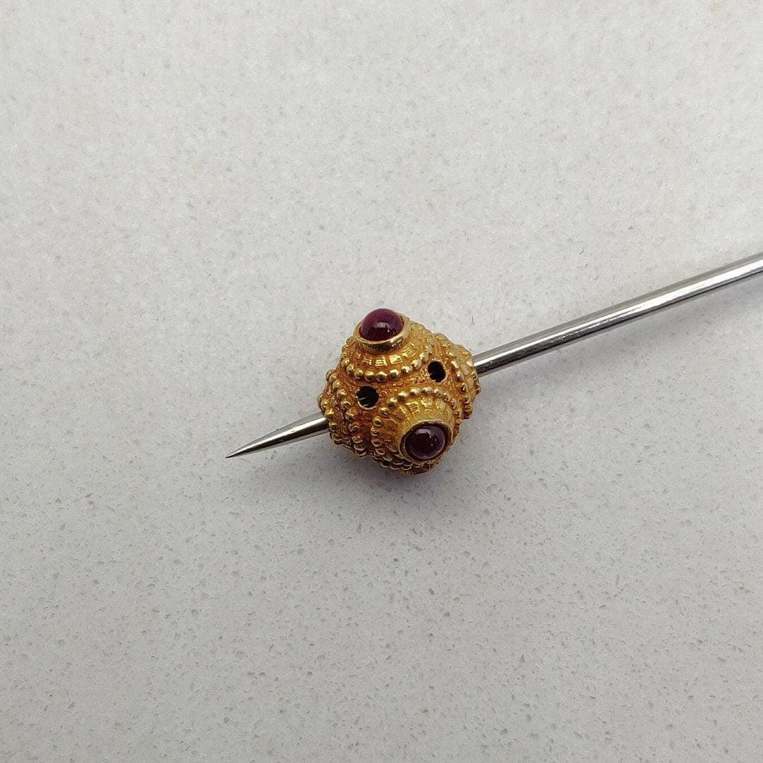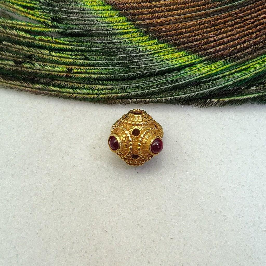 This 10mm 18K Yellow Gold Spacer Bead with Ruby Stone adds luxury and sophistication to any jewelry piece. Perfect for bracelets or necklaces, it elevates your style with timeless elegance.