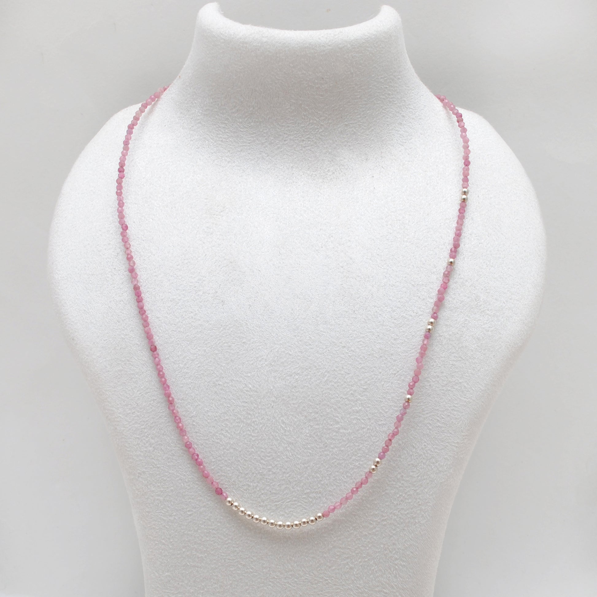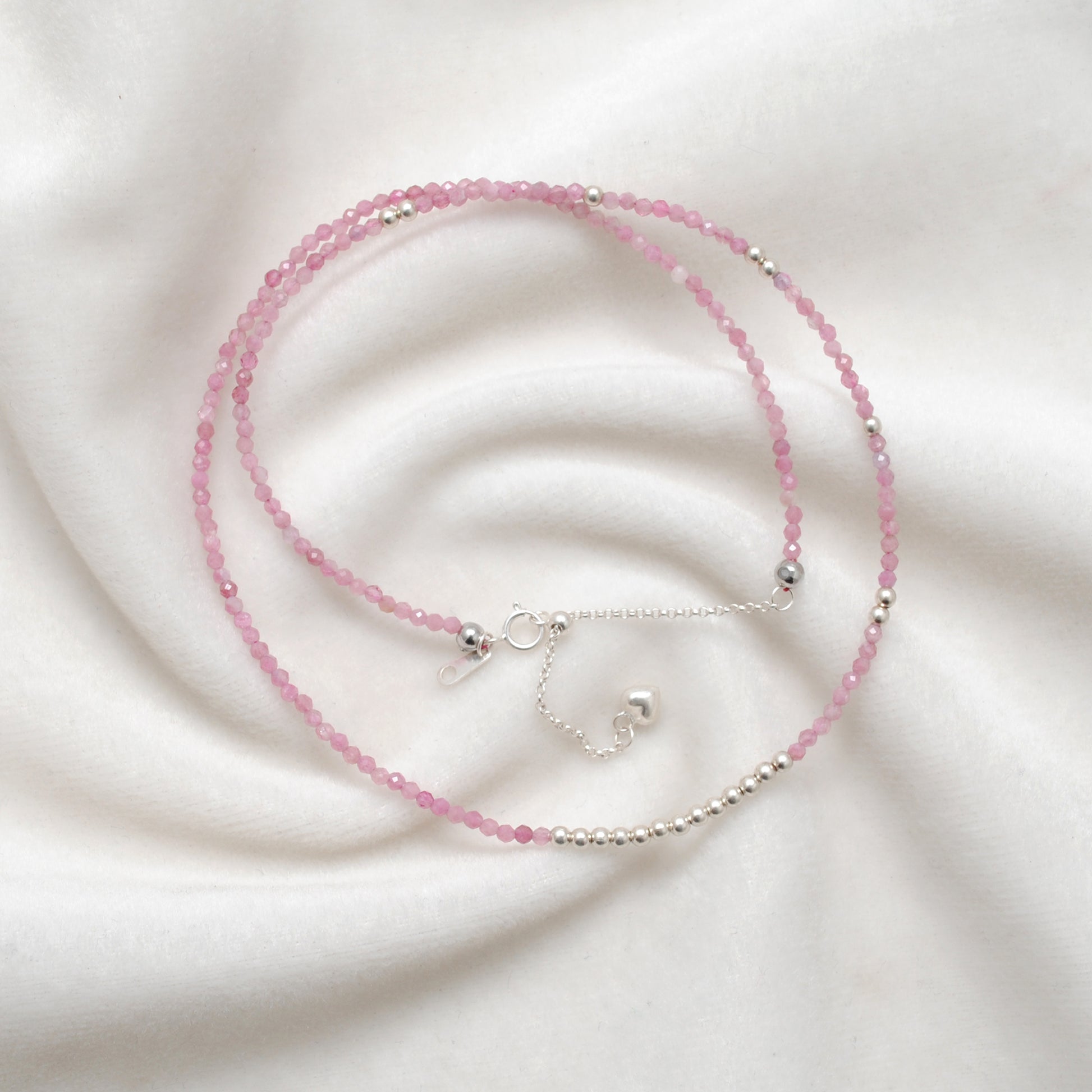 Delicate, colorful, and full of charm — this handcrafted 18-inch necklace features natural 2mm faceted pink tourmaline gemstone beads, strung on genuine 925 sterling silver. A minimalist piece perfect for everyday wear or gifting on special occasions.