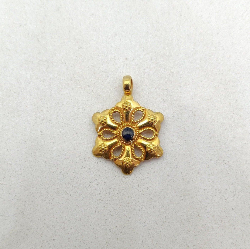 18k Solid Yellow Gold Blue Sapphire Floral Charm Pendant
