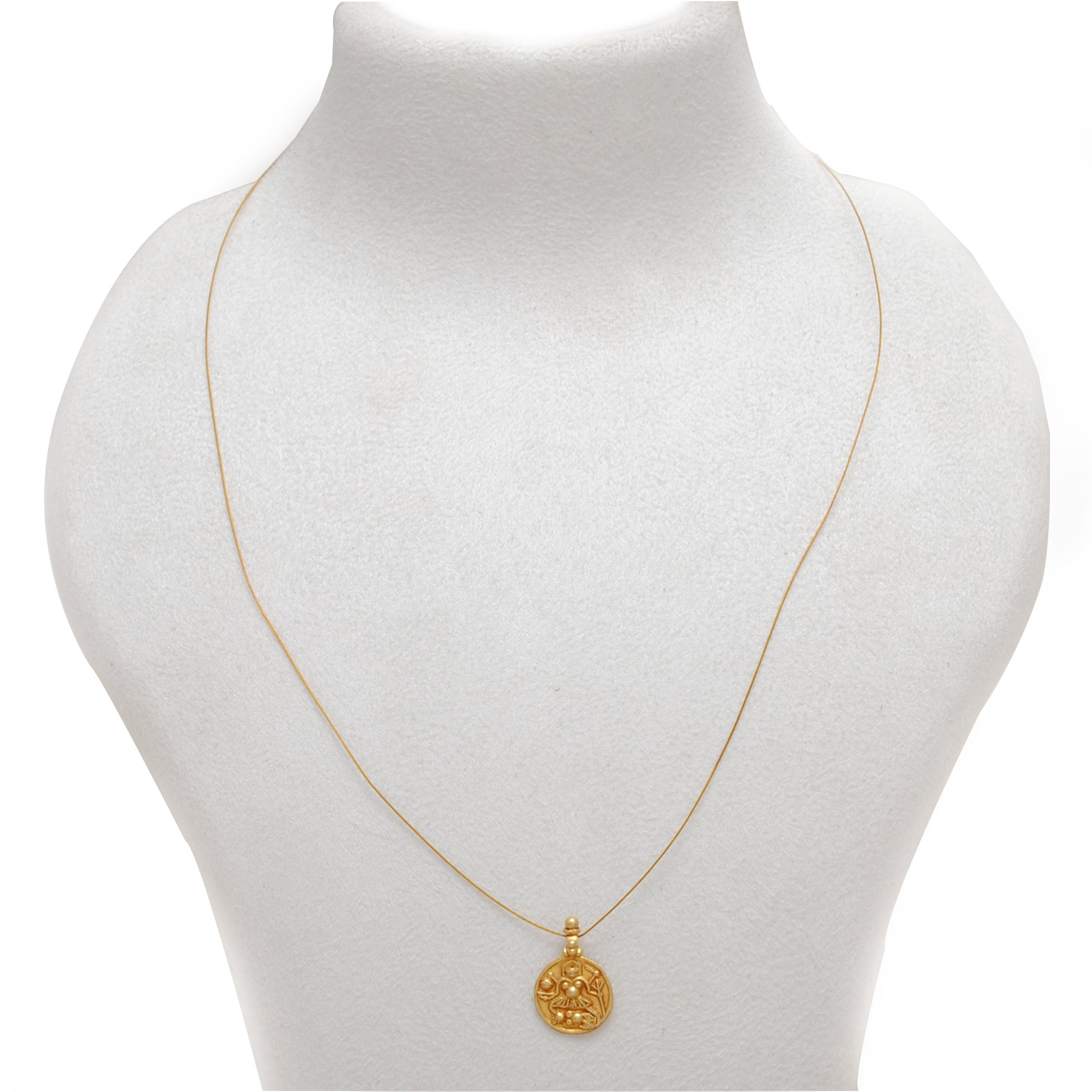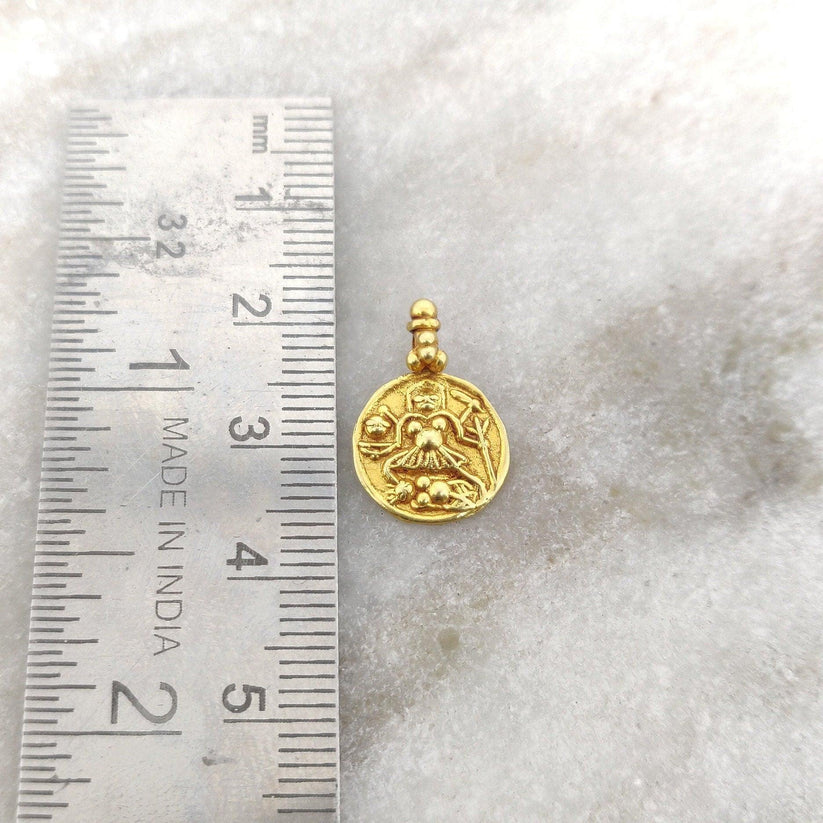 This 18K gold charm pendant features the Indian goddess Laxmi, symbolizing wealth, prosperity, and good fortune. Crafted with expert precision and attention to detail, this elegant pendant serves as a timeless piece of jewelry and brings positive energy and blessings to its wearer.