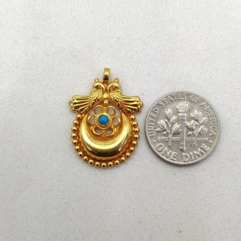 18k Solid Yellow Gold Turquoise Love Birds with Moon Pendant