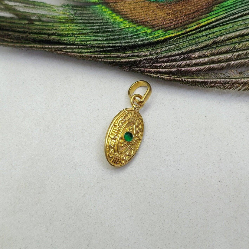 18k gold, this pendant is a luxurious addition to any jewelry collection. The intricate texture adds a touch of elegance, while the emerald stone provides a pop of color. Elevate your style with this exquisite piece.
