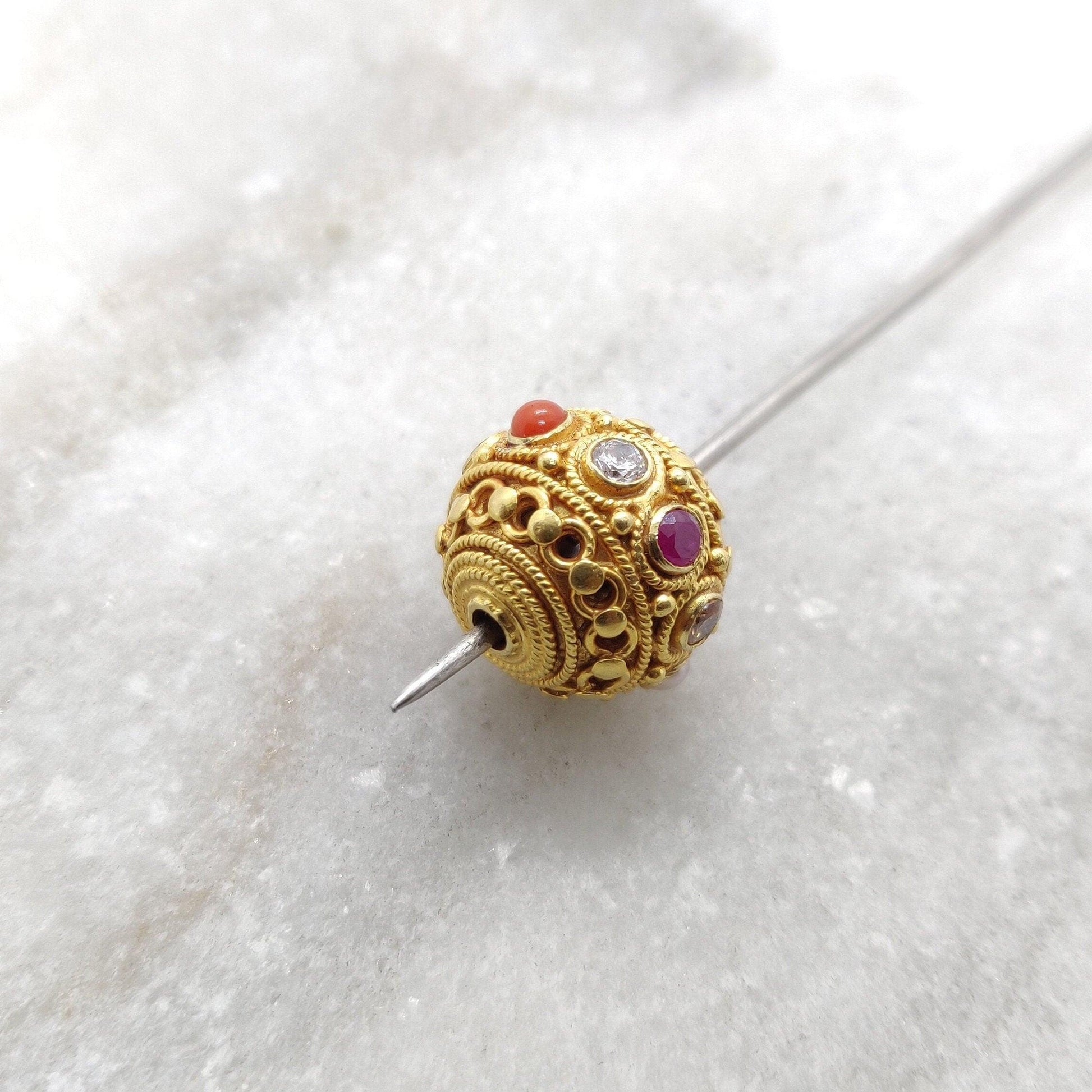 Add a touch of luxury and elegance to your jewelry designs with our Navratan Color Stone 18k Gold Spacer Beads. These 12.5MM Round beads are expertly crafted with premium-quality 18k gold and feature a stunning array of colorful gemstones.