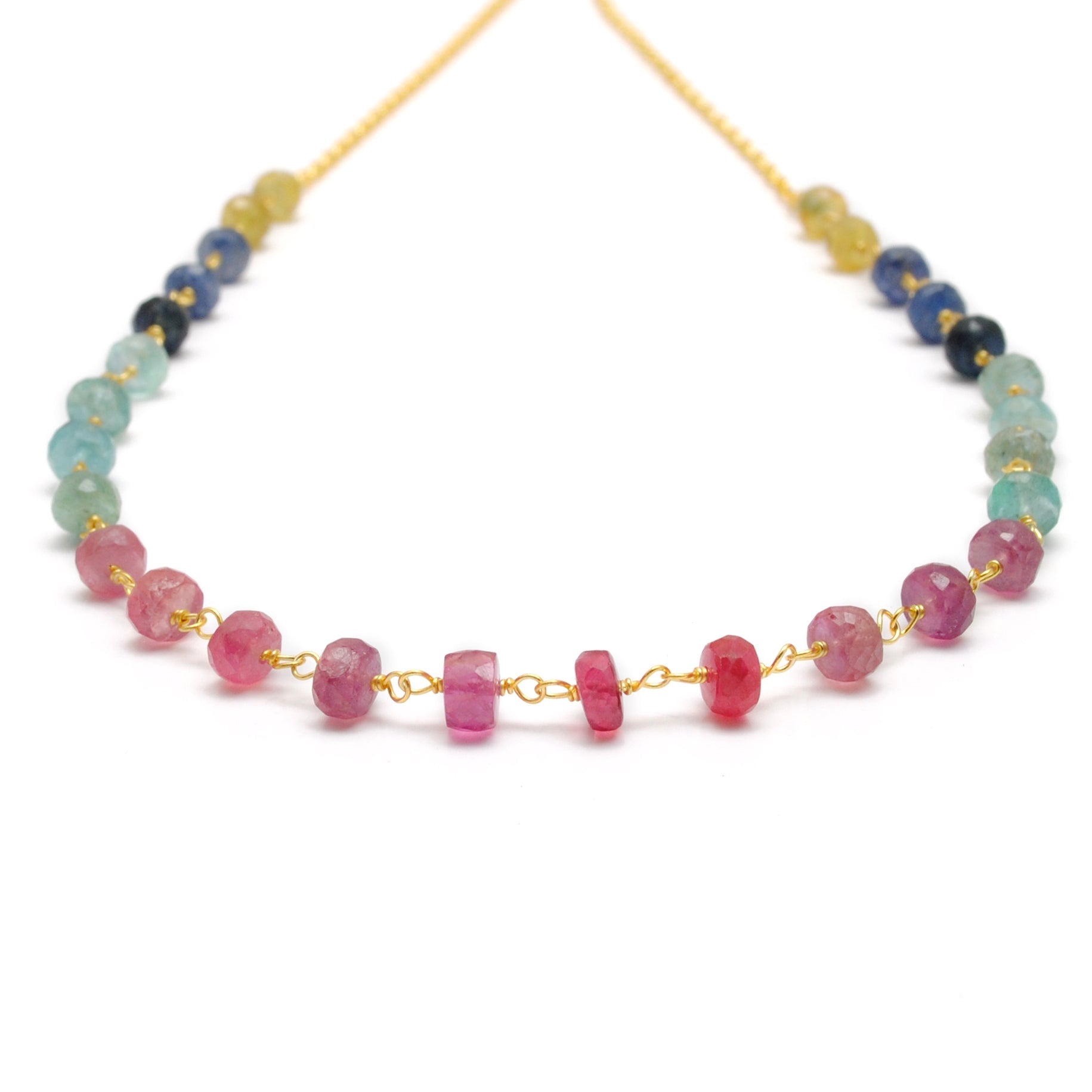 Expertly crafted with exquisite 5mm multi sapphires, this 18k gold plated necklace is perfect for adding a touch of luxury to any outfit. The stunning gemstones are arranged in a unique and intricate design, making this necklace a true statement piece. Elevate your style with this timeless and sophisticated necklace.