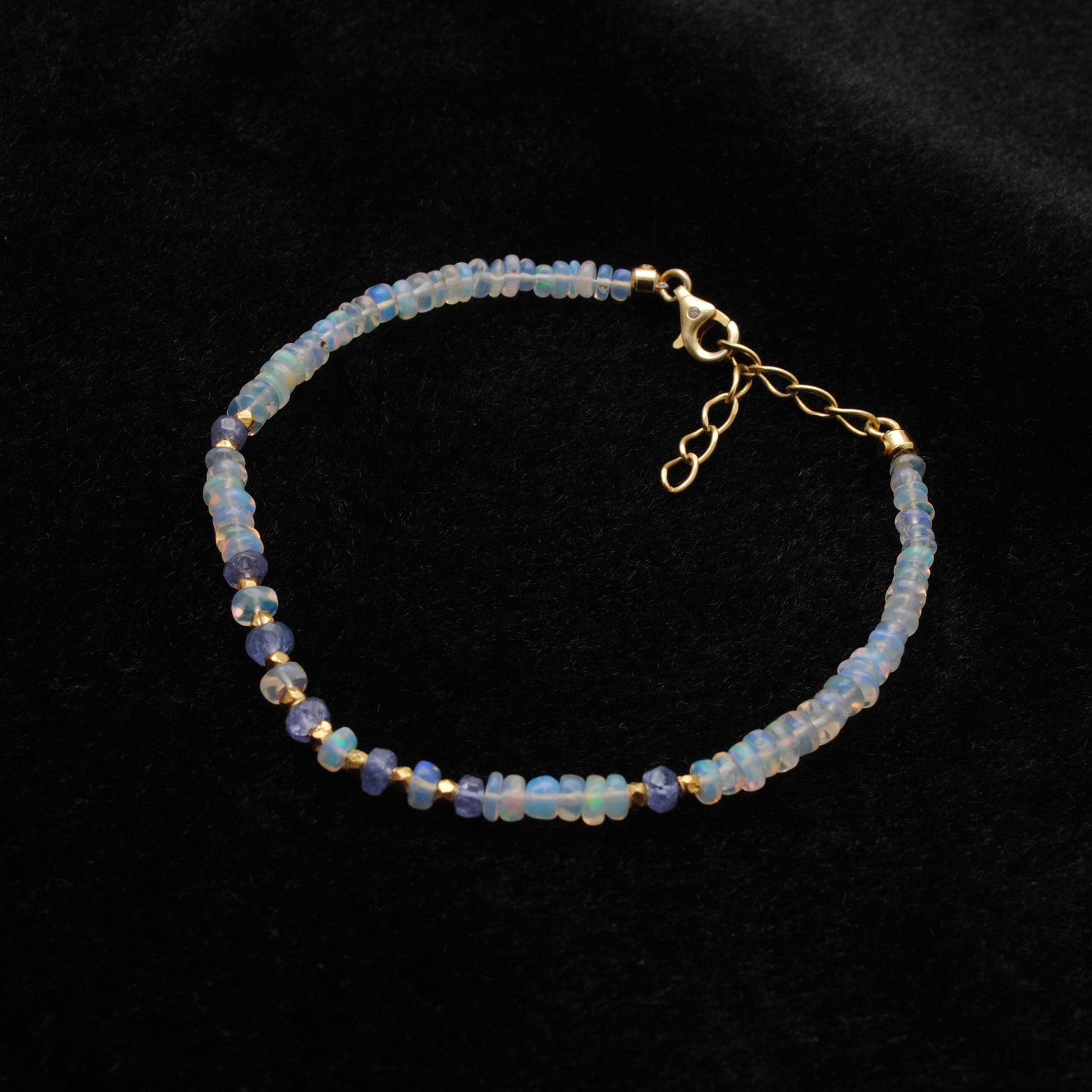 Add a touch of ethereal beauty to your jewelry collection with this exquisite 8-inch handmade bracelet. Designed with shimmering opal and vibrant tanzanite gemstone beads, this gold-plated sterling silver piece offers timeless elegance for any occasion.