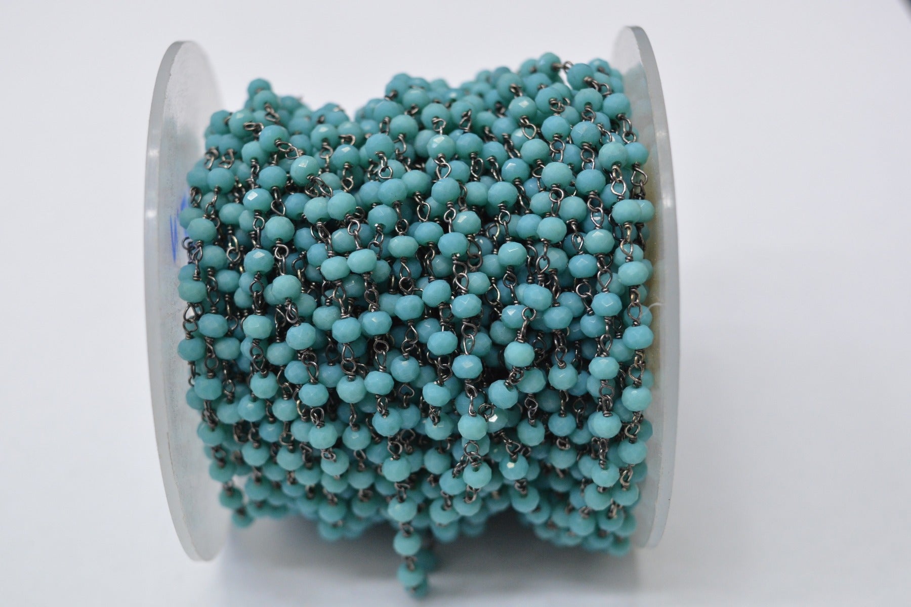 925 Sterling Silver Gold Plated Wire Wrapped Rosary Chain With Roundel 3.00mm Sky Blue Agate Stone. Sold By foot, ROS2-5452