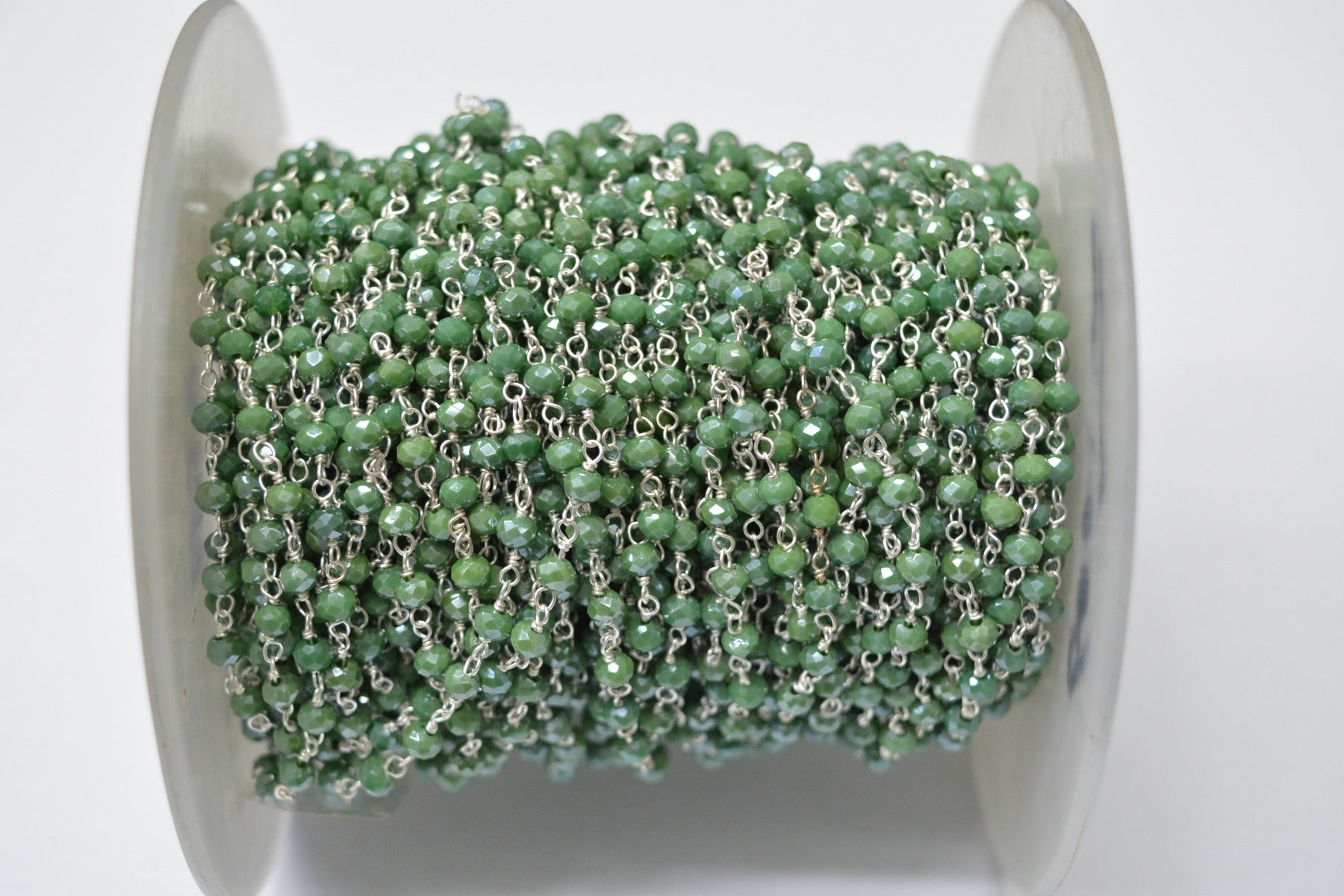 925 Sterling Silver Gold Plated Wire Wrapped Rosary Chain-3.00mm Green Chalcedony Coated Roundell Running Chain. Sold By foot, ROS2-5522