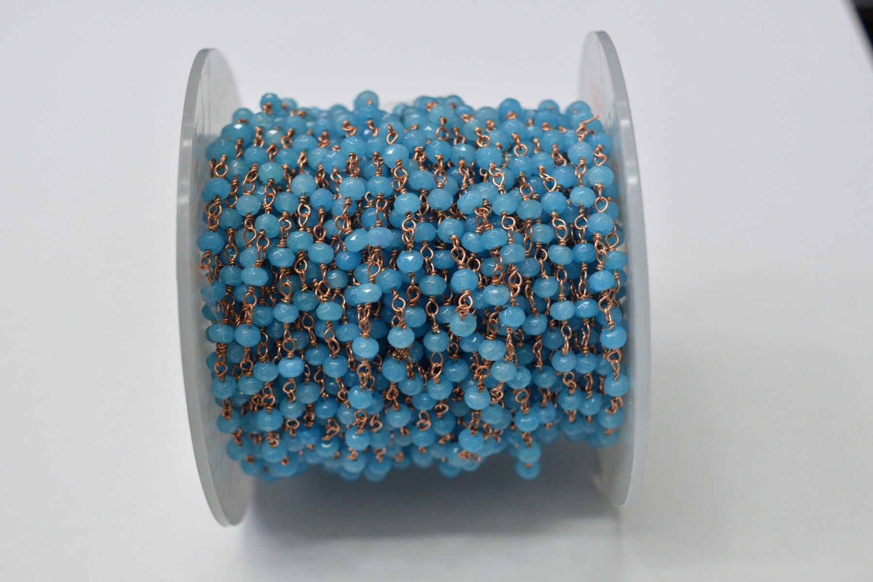 925 Sterling Silver Gold Plated Roundel Shape 3.00mm Wire Wrapped Rosary Chain With Blue Topaz Jade Stone. Sold By foot, ROS2-5459