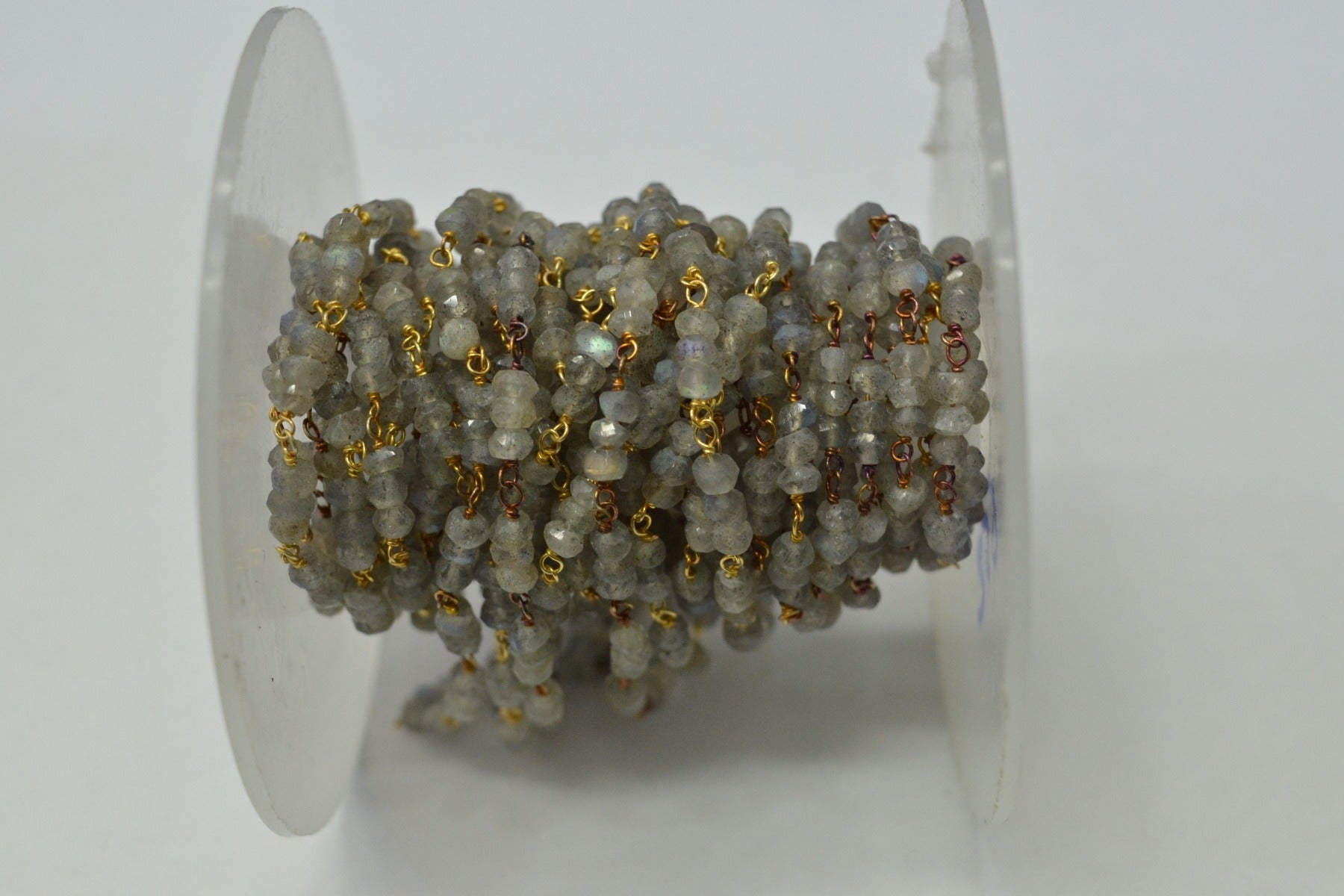925 Sterling Silver Gold Plated Roundel Shape 3.00mm Wire Wrapped Rosary Chain With Labradorite Stone. Sold By foot, ROS2-5652