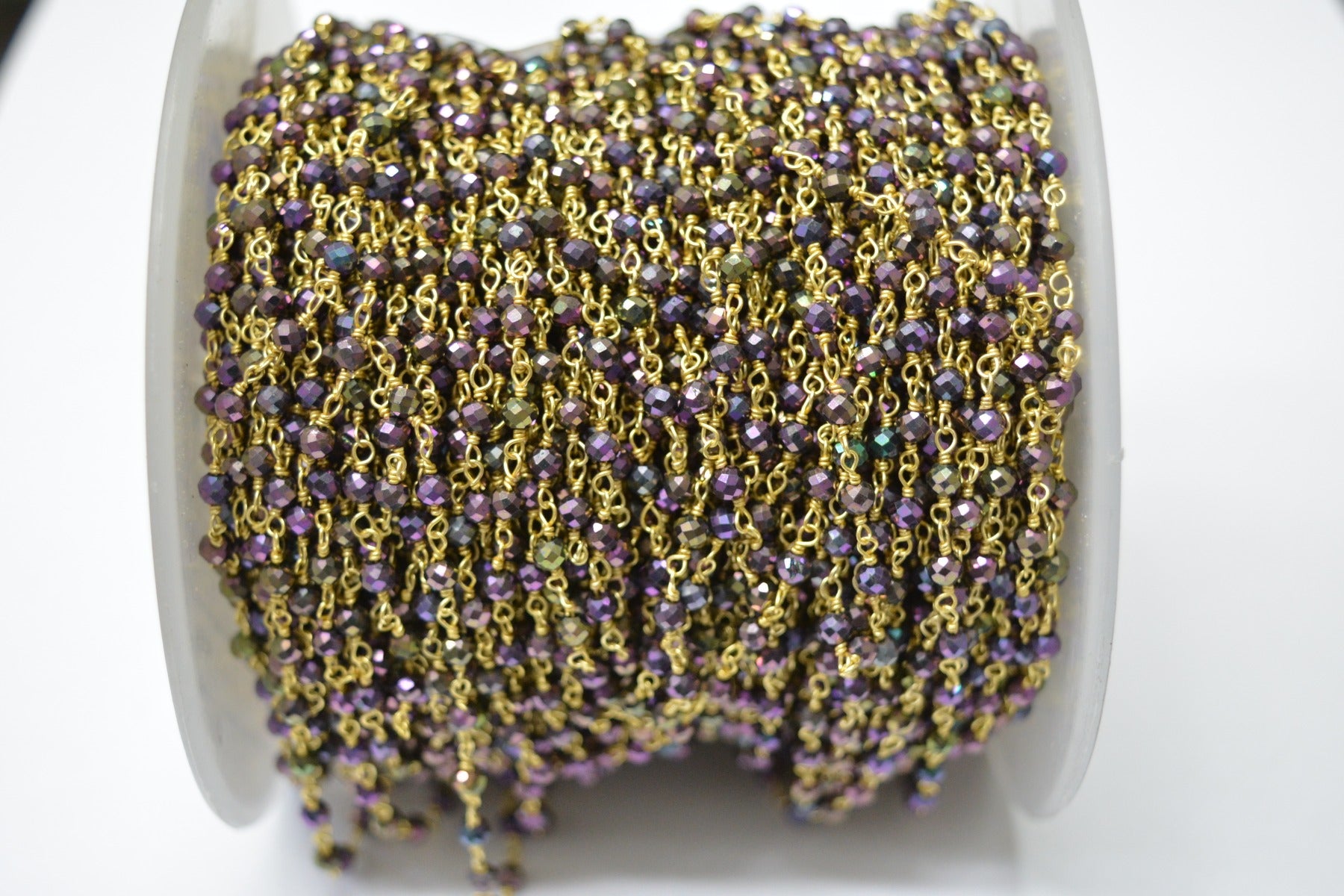 925 Sterling Silver Gold Plated Roundel 3.00mm Wire Wrapped Rosary Chain With Mystik Pink Coated Stone. Sold By foot, ROS2-5488