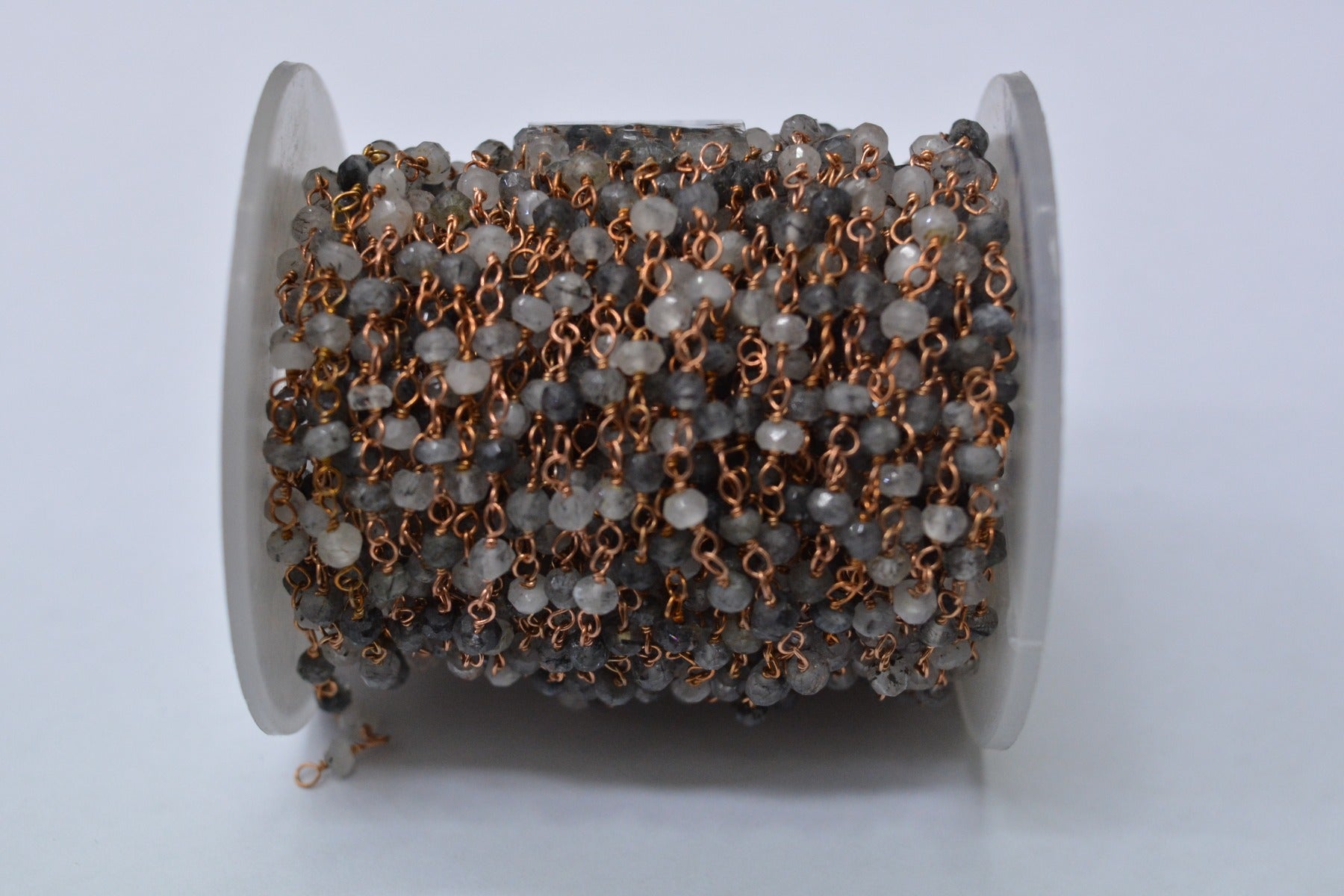 925 Sterling Silver Gold Plated Wire Wrapped Rosary Chain With Roundel Shape 3.00mm Black Rutile Stone. Sold By foot, ROS2-5629