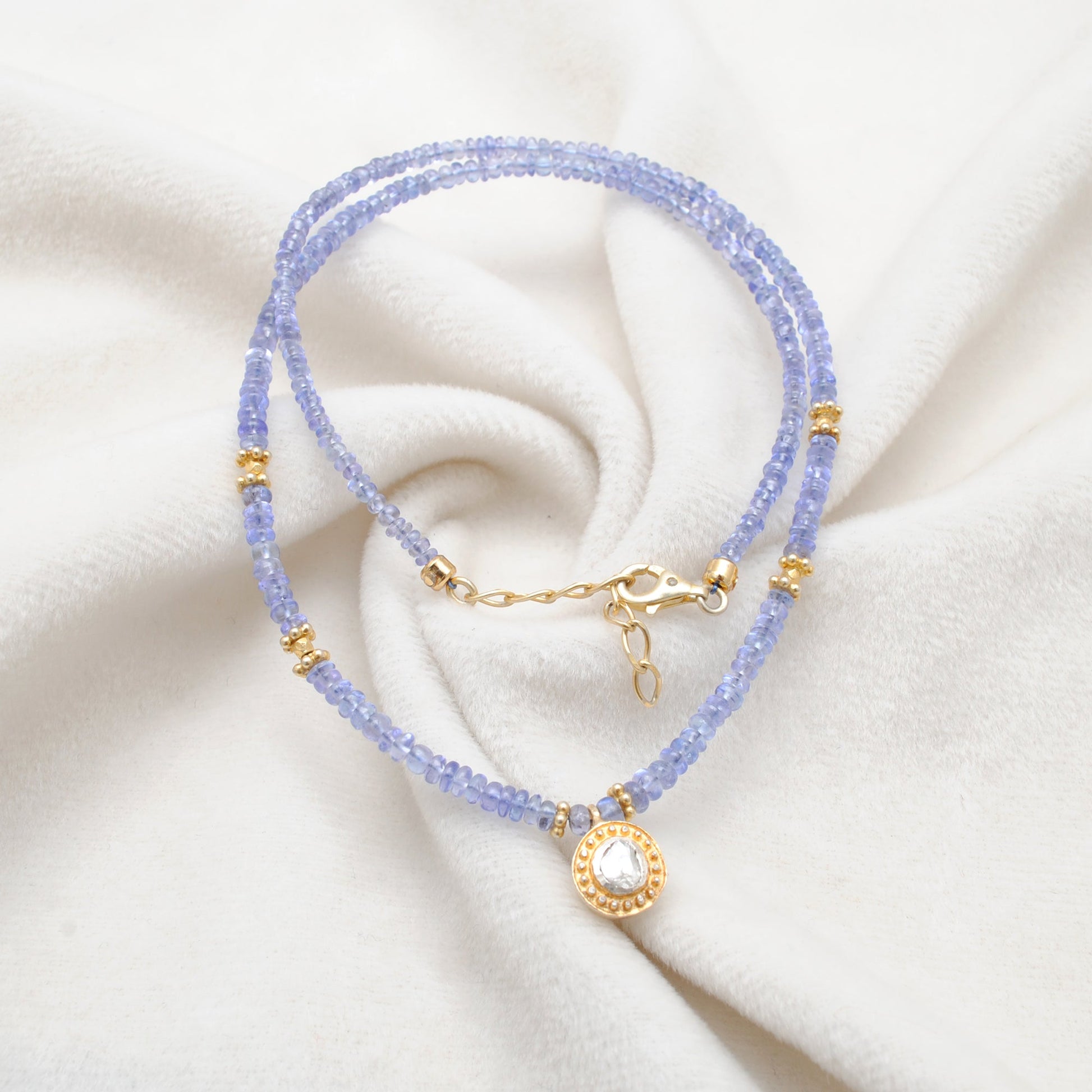 Elevate your elegance with this 925 Sterling Silver Gold-Plated Tanzanite Beads Necklace, featuring a sparkling Rose Cut Diamond pendant. Handcrafted with precision, this necklace is perfect for birthdays, anniversaries, weddings, or as a luxurious gift for women.