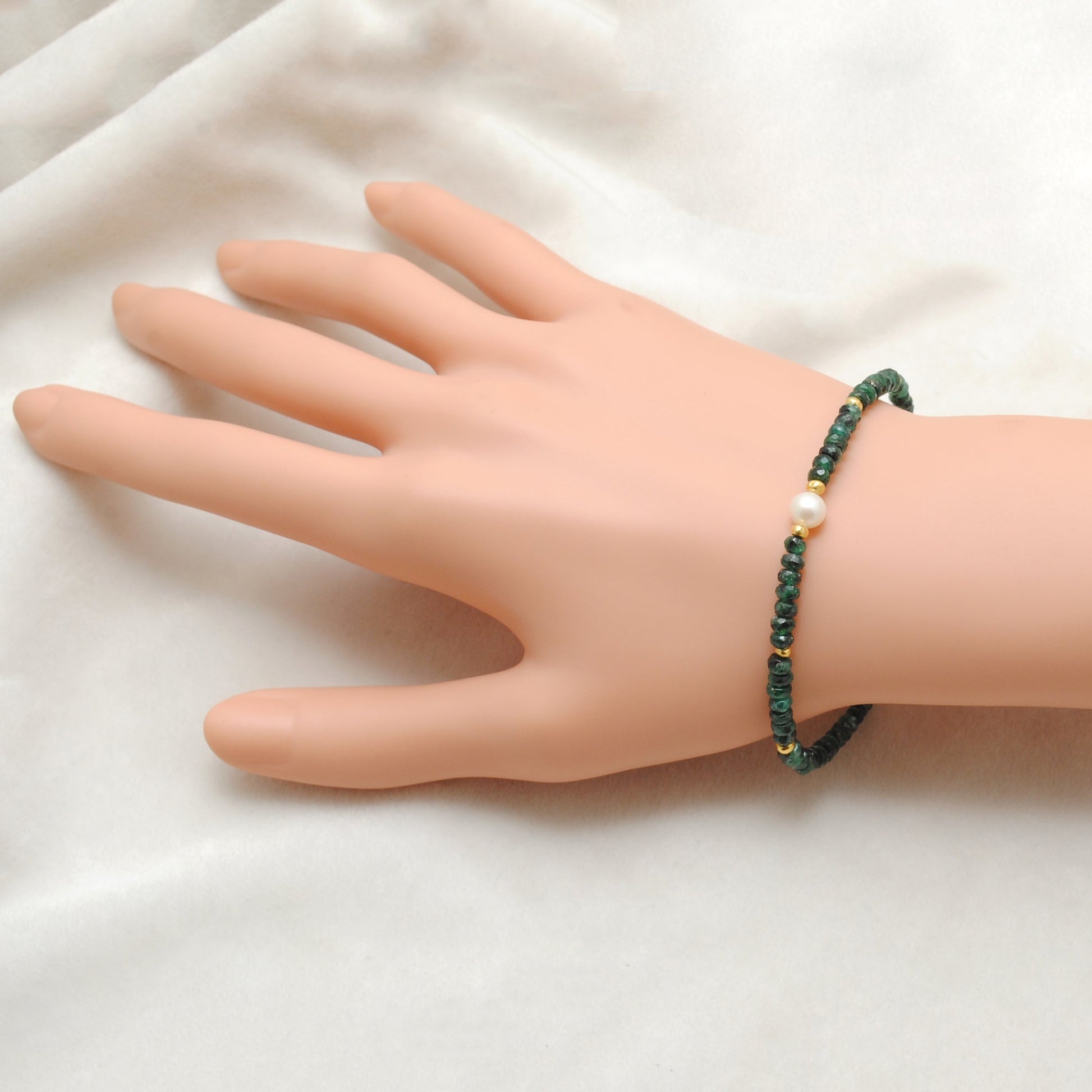 A graceful combination of emerald and freshwater pearls, this bracelet is handcrafted in 925 sterling silver with a fine gold plating. Perfect for both special occasions and everyday elegance.
