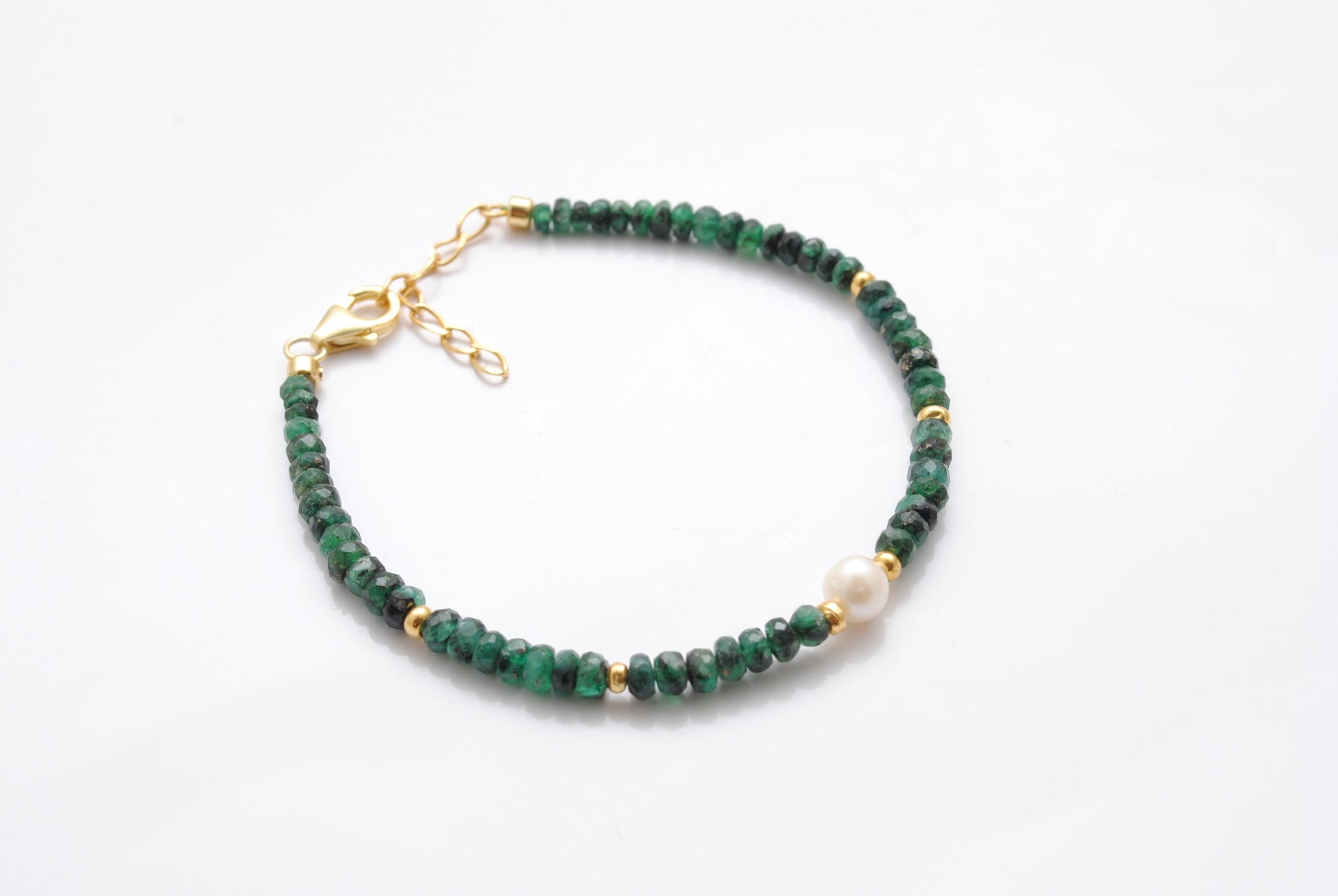925 Sterling Silver Emerald & Pearl Beaded Bracelet Handmade Beaded Jewelry