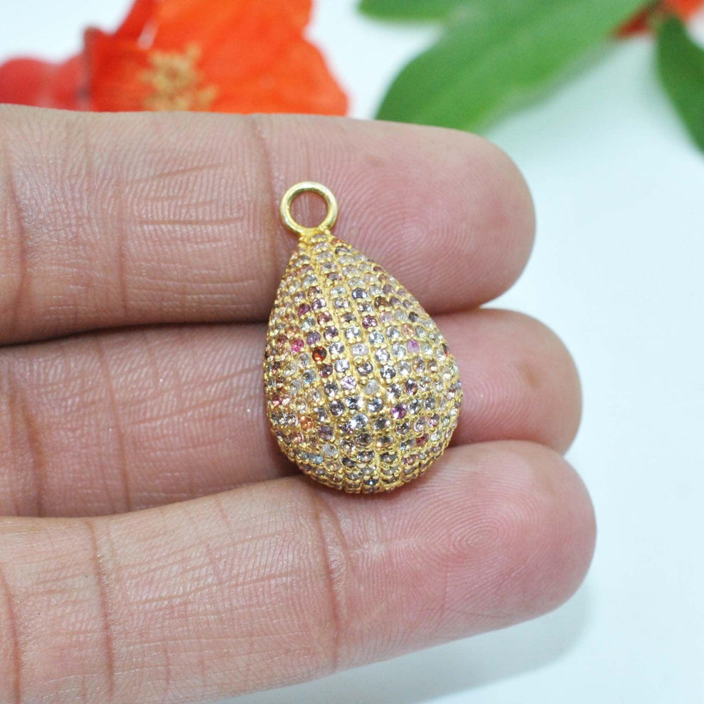 Multi Sapphire Tear Drop Charm Finding in a luxurious gold finish. These beautiful tear drop charms feature multiple sapphires that will add a pop of color to any accessory. Upgrade your style with this stunning and professional-looking piece.