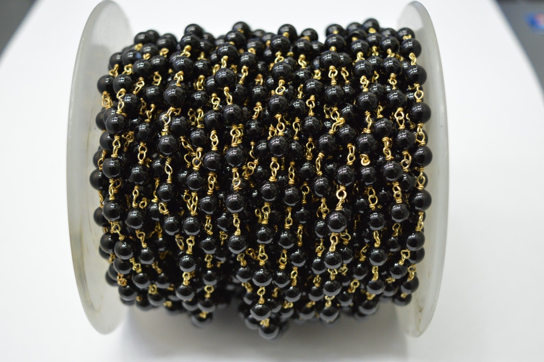 925 Sterling Silver Gold Plated Round Ball Shape 4.00mm Wire Wrapped Rosary Chain With Black Onyx Stone. Sold By foot, ROS2-5661