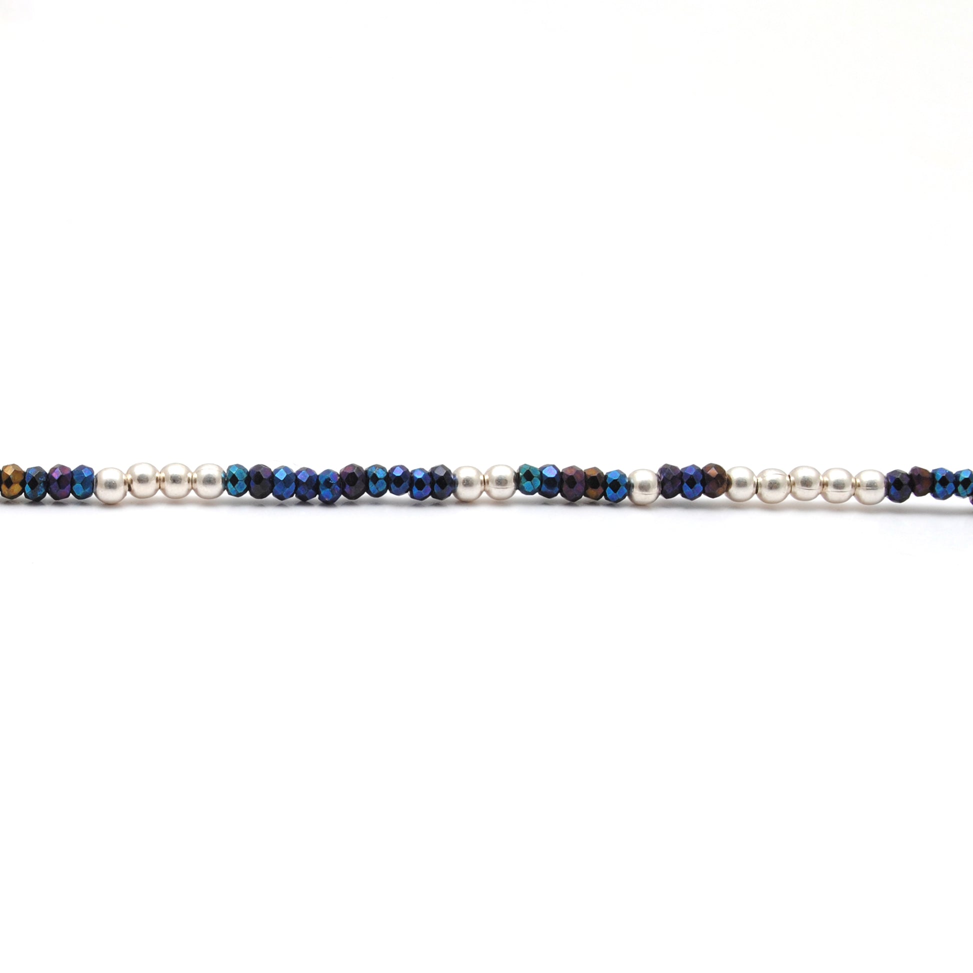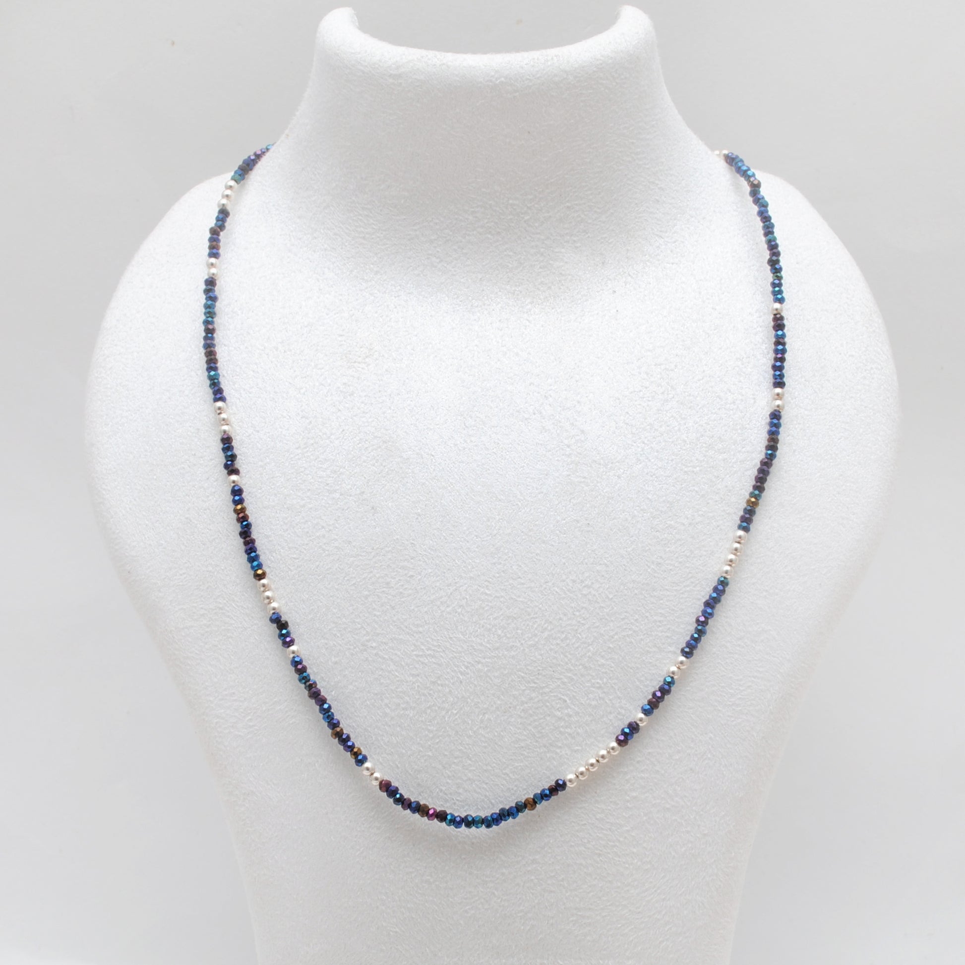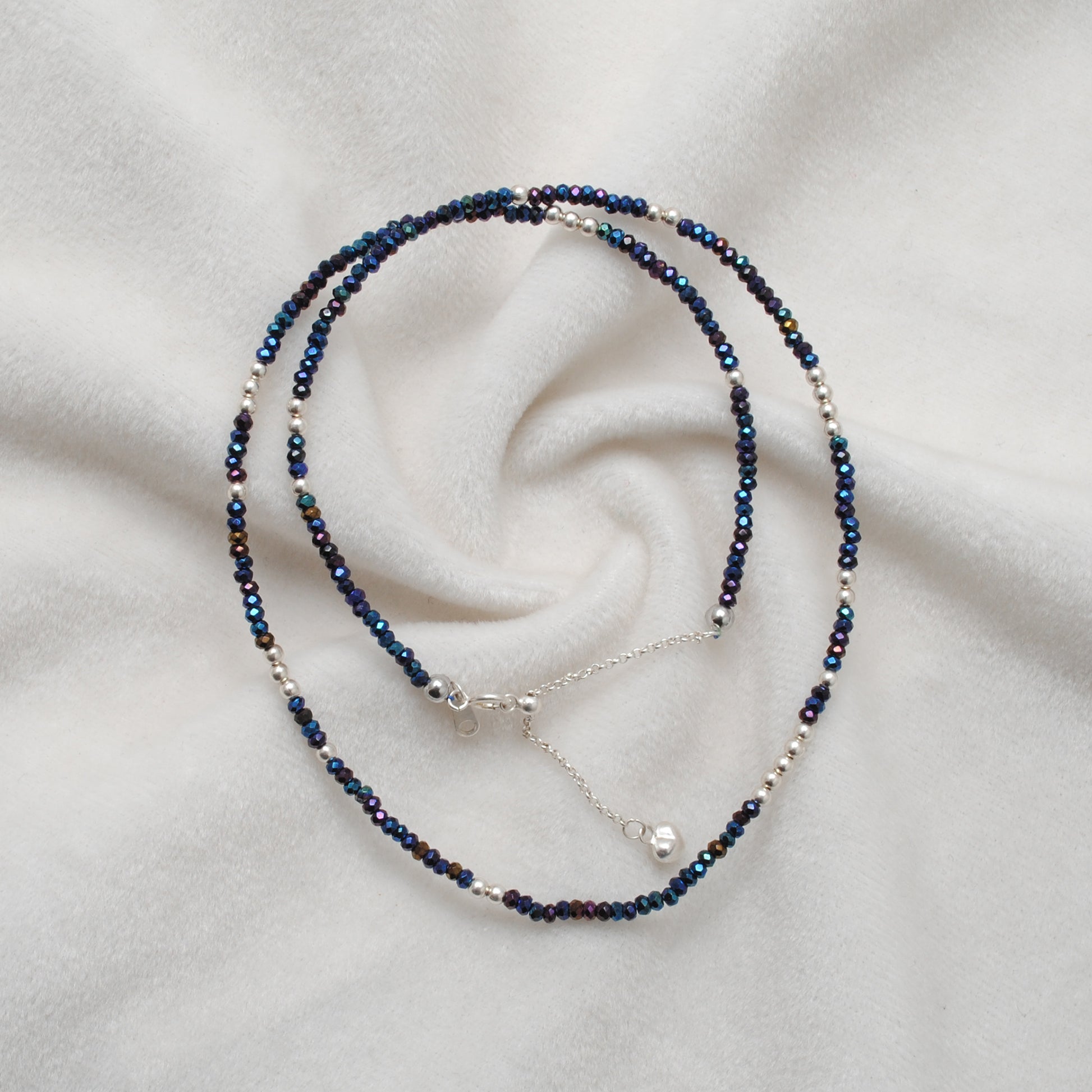 Add a touch of shimmer and charm to your jewelry collection with this beautiful Blue Mystic Coated Beaded Necklace. Featuring dazzling mystic-coated beads in varying shades of deep blue and iridescent hues, this necklace is handcrafted with 925 sterling silver beads and delicate silver charms for a luxurious yet artistic look. Lightweight and comfortable, it's perfect for everyday elegance or layering with other favorites. Whether you're dressing up for a special occasion or elevating your casual outfit, this necklace offers the perfect finishing touch.
