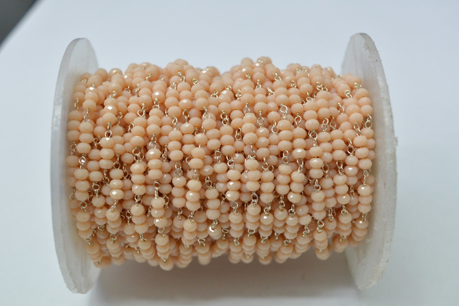 925 Sterling Silver Gold Plated Roundel Shape 3.00mm Wire Wrapped Rosary Chain With Peach Chalcedony Stone. Sold By foot, ROS2-5658