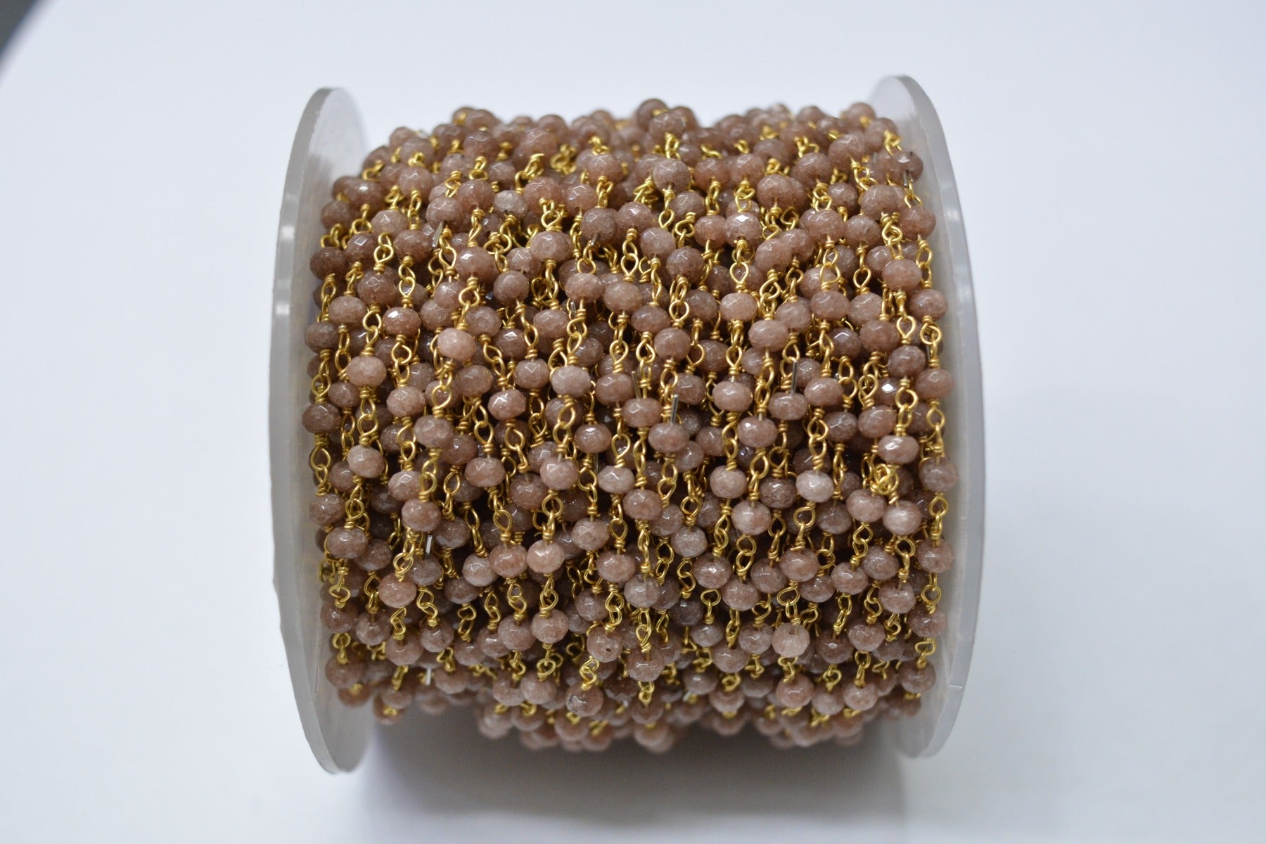 925 Sterling Silver Gold Plated Roundel Shape 3.00mm Wire Wrapped Rosary Chain With Brown Chalcedony Stone. Sold By foot, ROS2-5690