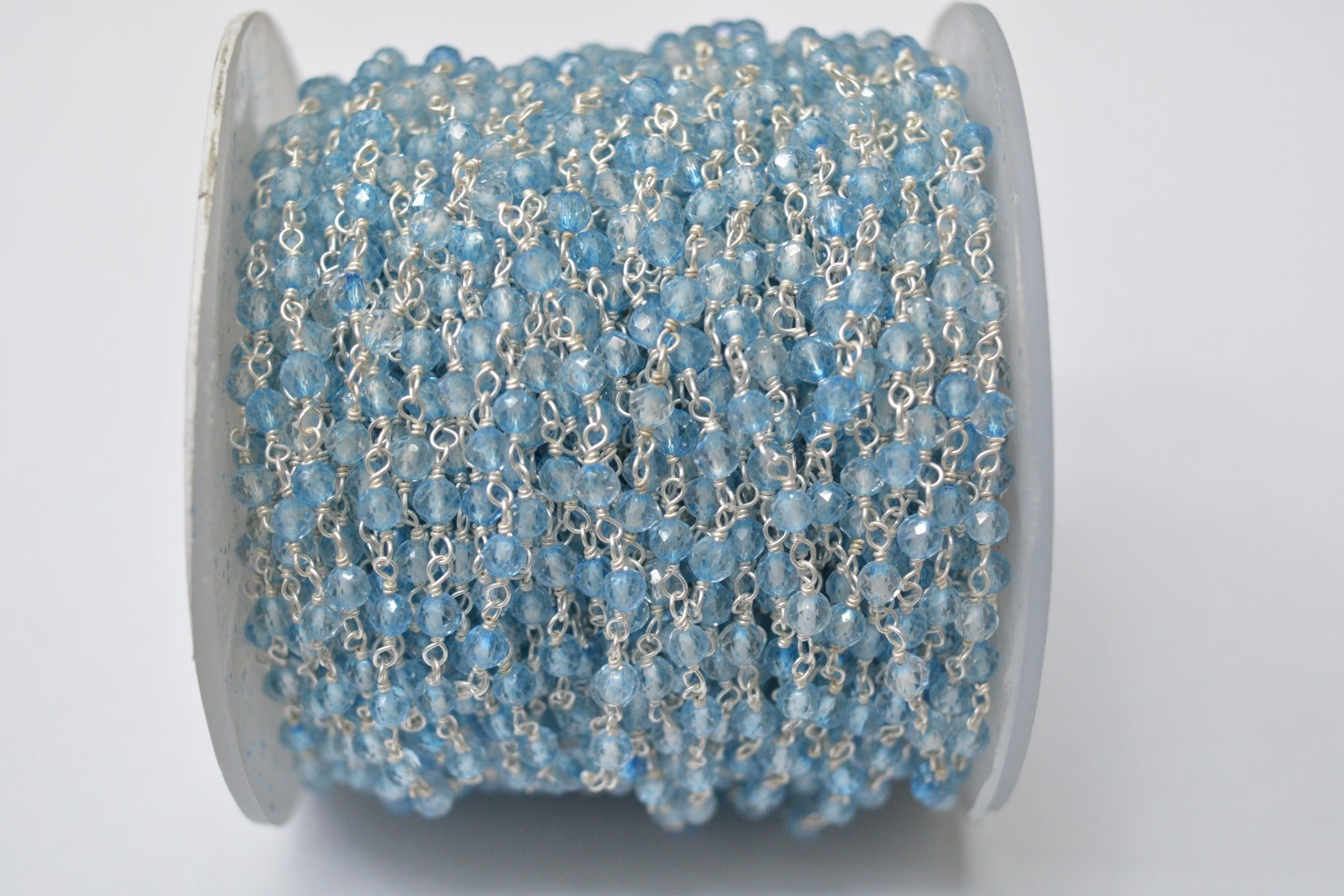 925 Sterling Silver Gold Plated Round Ball 3.00 mm Wire Wrapped Rosary Chain With Sky Blue Chalcedony Coated Stone. Sold By foot, ROS2-5483
