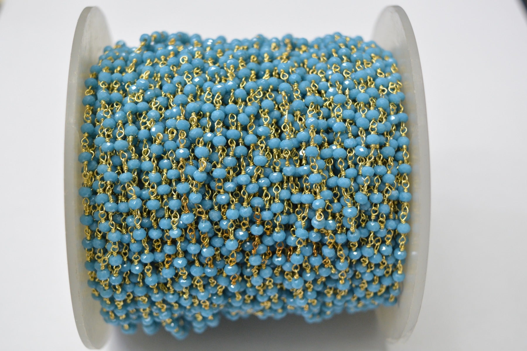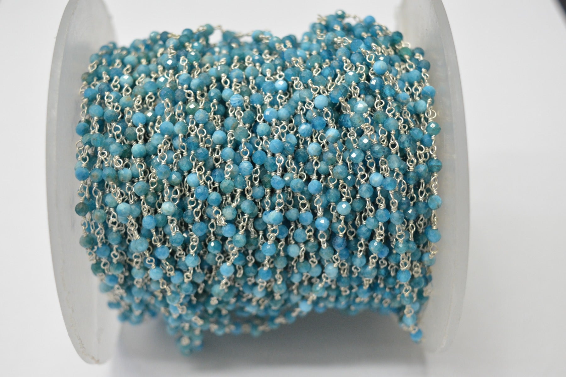 925 Sterling Silver Gorgeous 3.00mm Roundel Light Apatite Chalcedony Coated Stone Wire Wrapped Rosary Chain. Sold By Foot, ROS2-5460