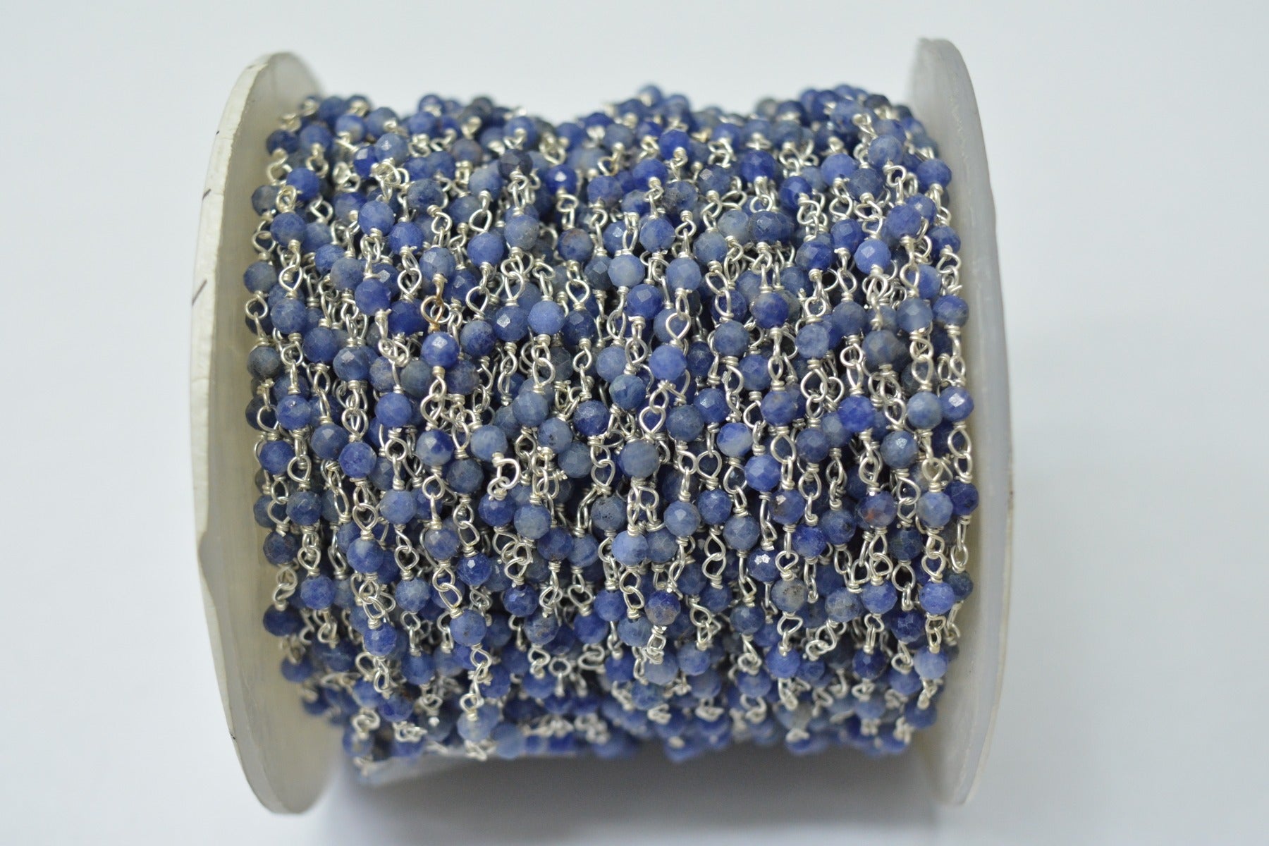 925 Sterling Silver Gold Plated Elegant Wire Wrapped Rosary Chain With Round Ball Shape 3.00mm Sodalite Stone. Sold By foot, ROS2-5595