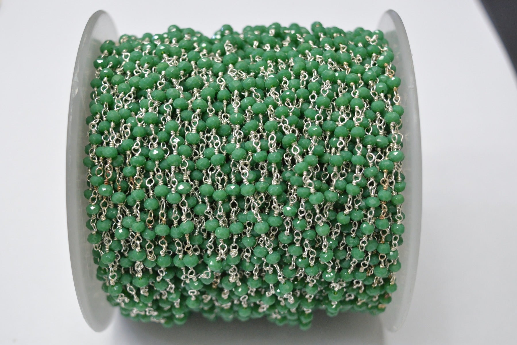925 Sterling Silver Gold Plated Wonderful Wire Wrapped Roundel Shape3.00mm Green Chalcedony Rosary Chains. Sold By Foot, ROS2-5528