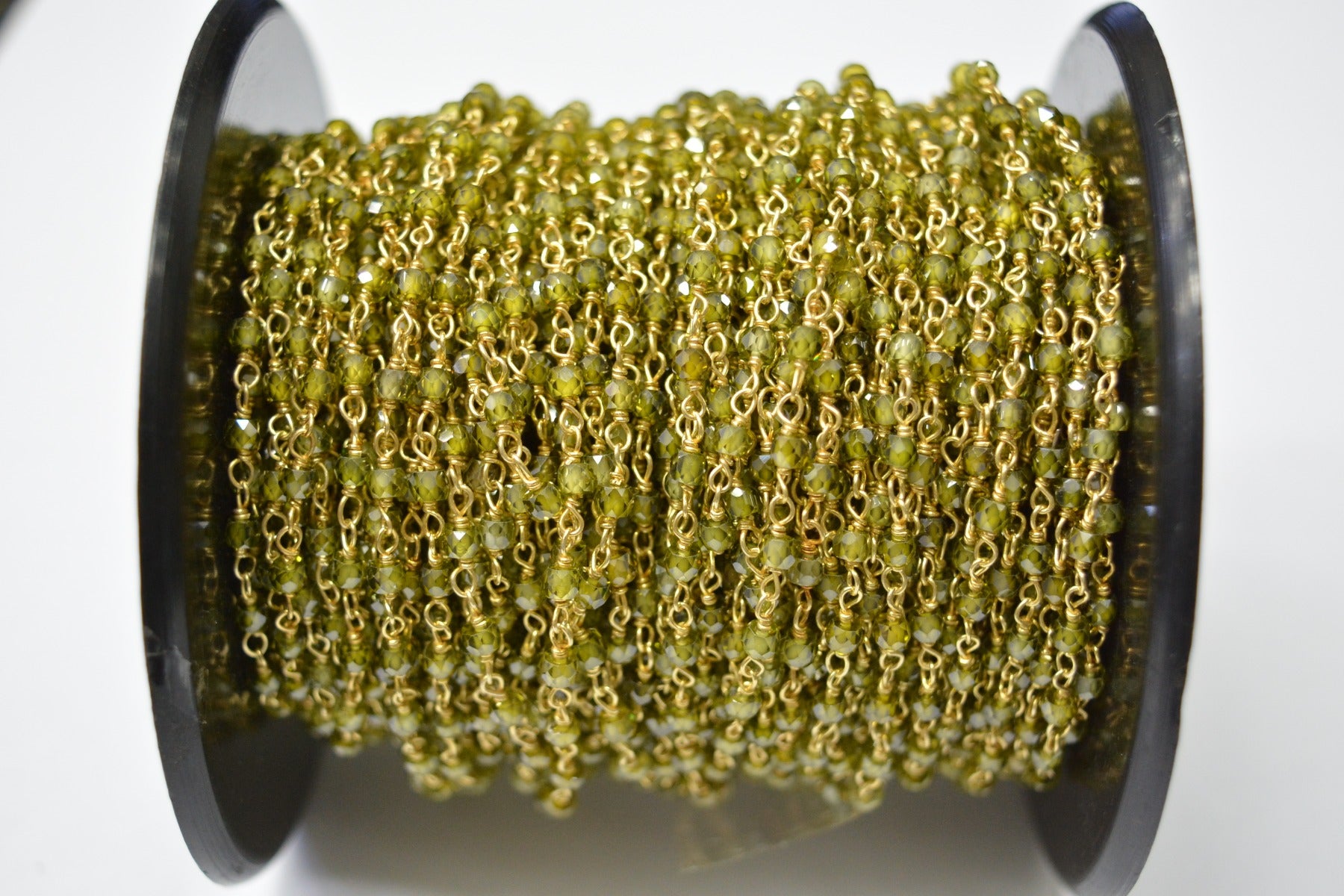 925 Sterling Silver Gold Plated Elegant Wire Wrapped Roundel Shape 3.00mm Green Cubic Zirconia Rosary Chains. Sold By Foot, ROS2-5505