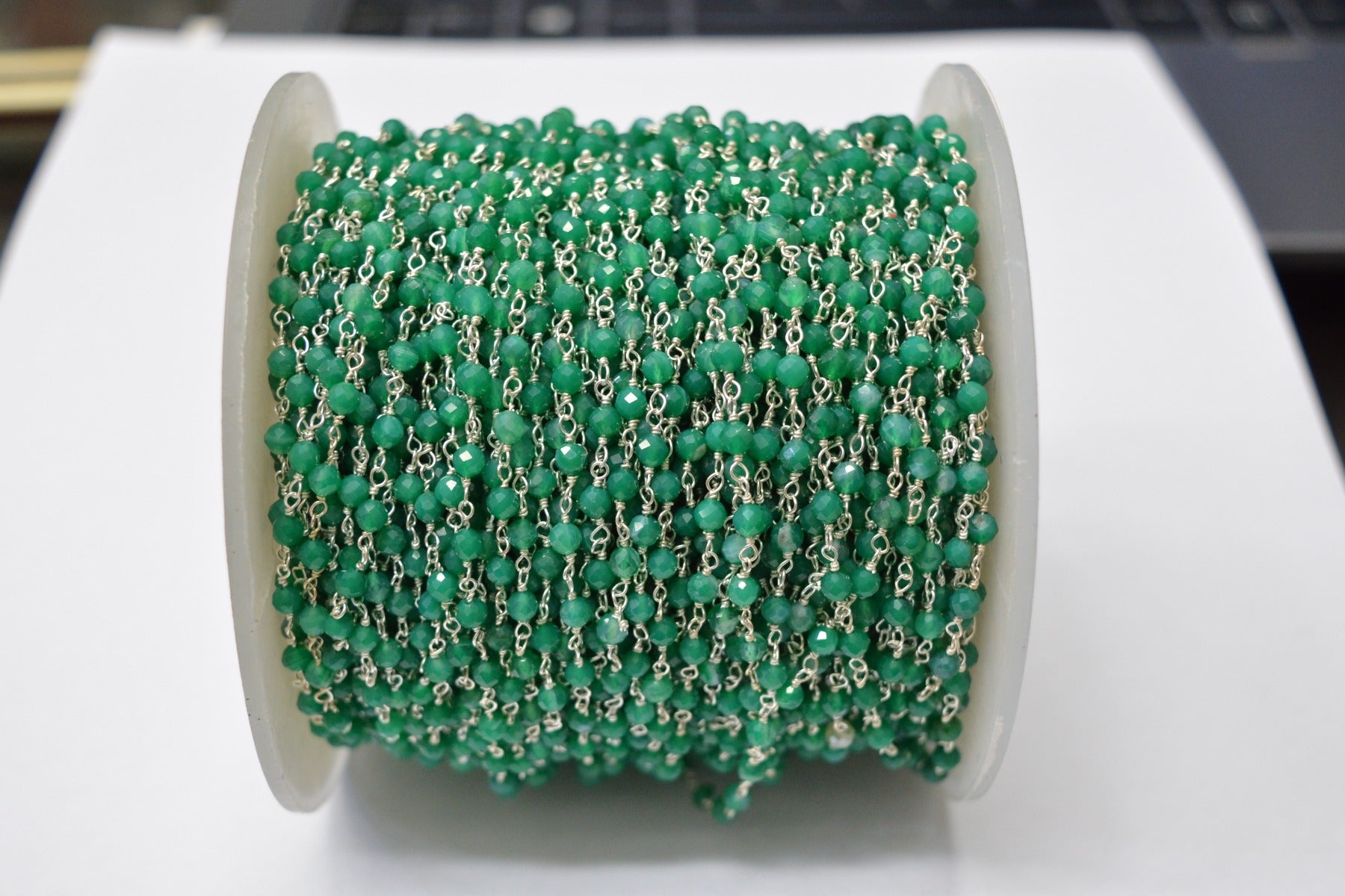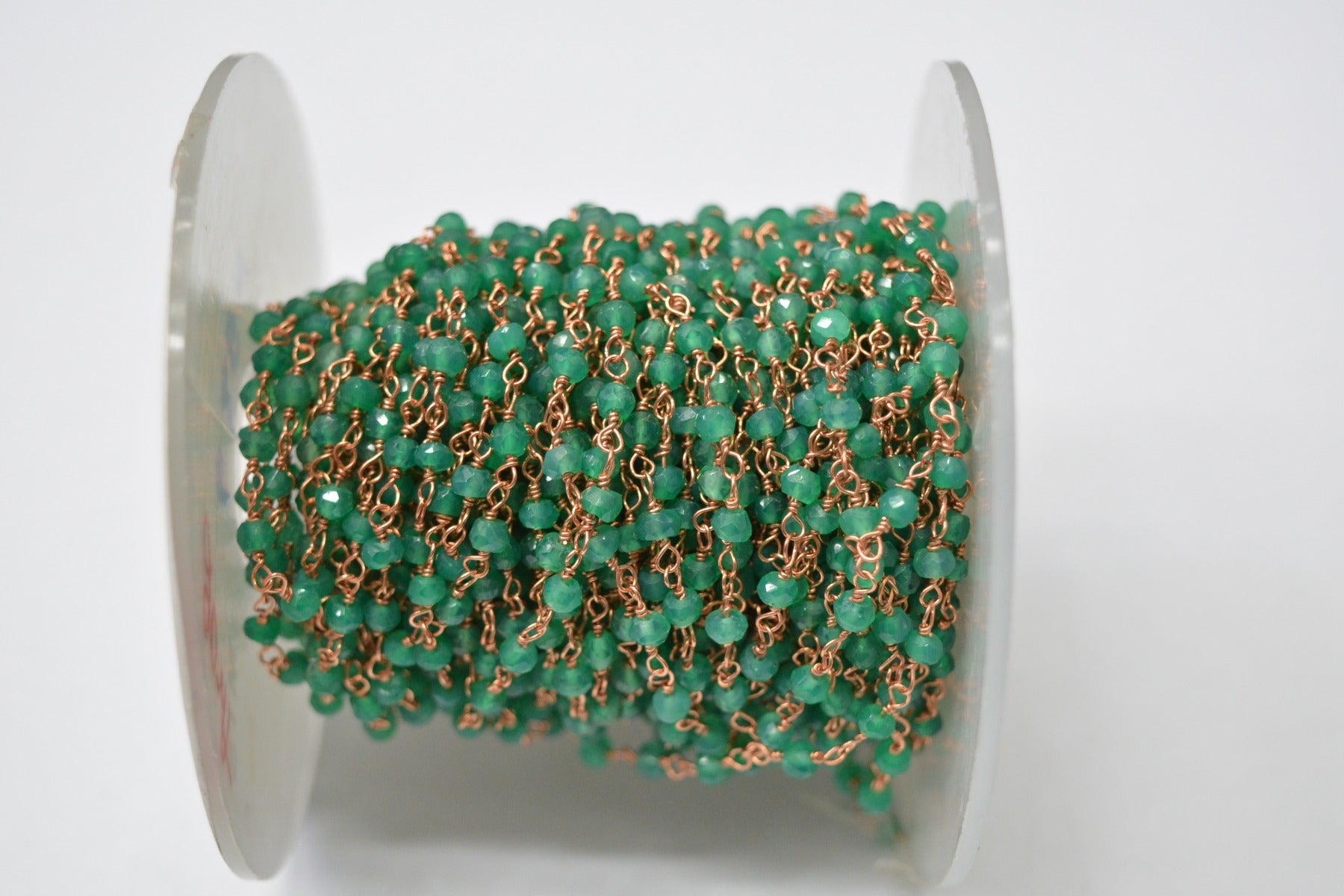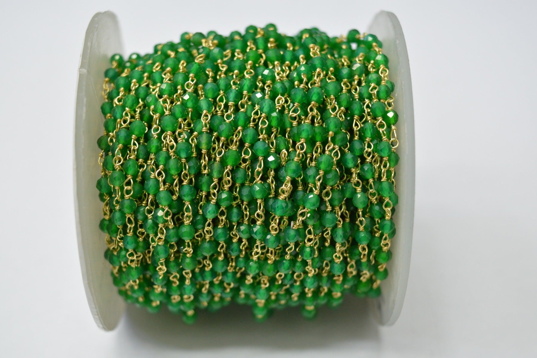 925 Gold Plated Sterling Silver Graceful 3.00 mm Green Onyx Stone Wire Wrapped Rosary Chain. Sold By Foot, ROS2-5584