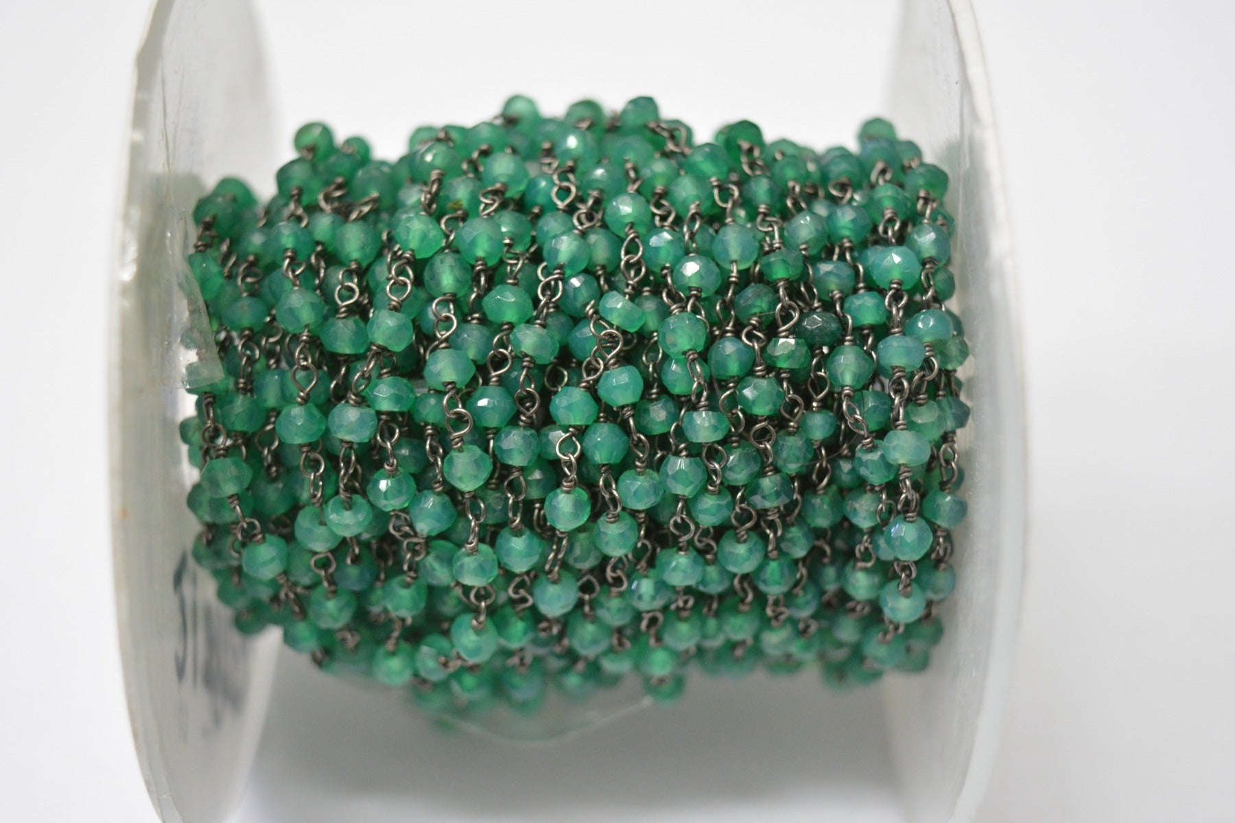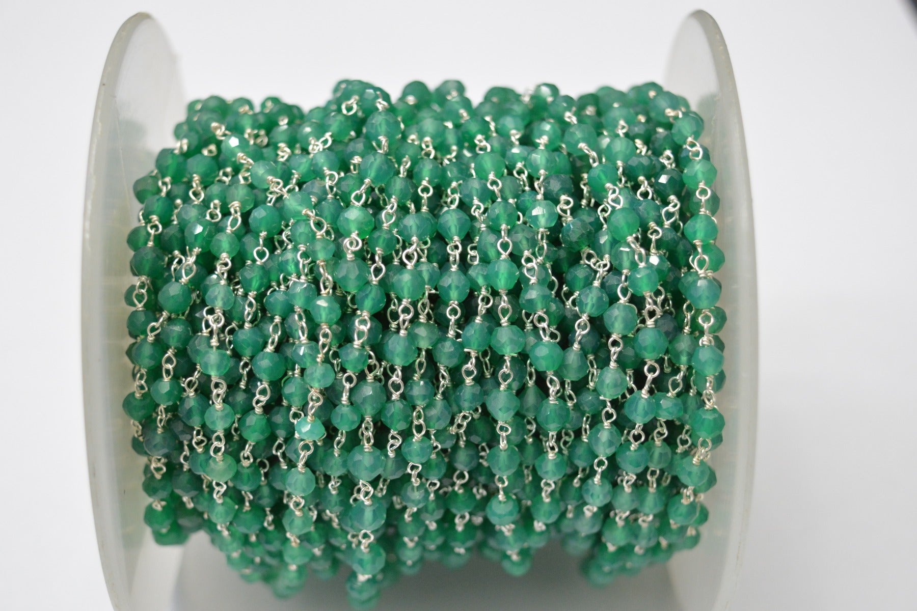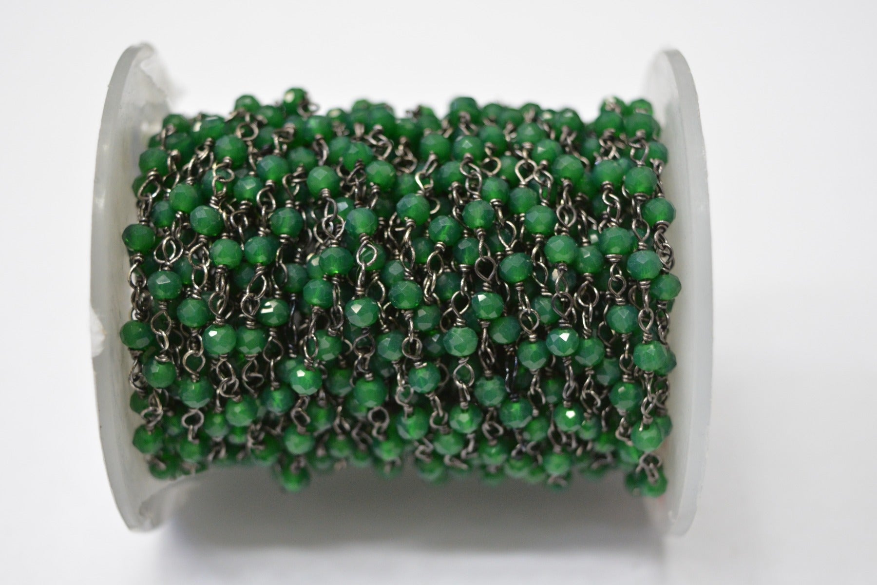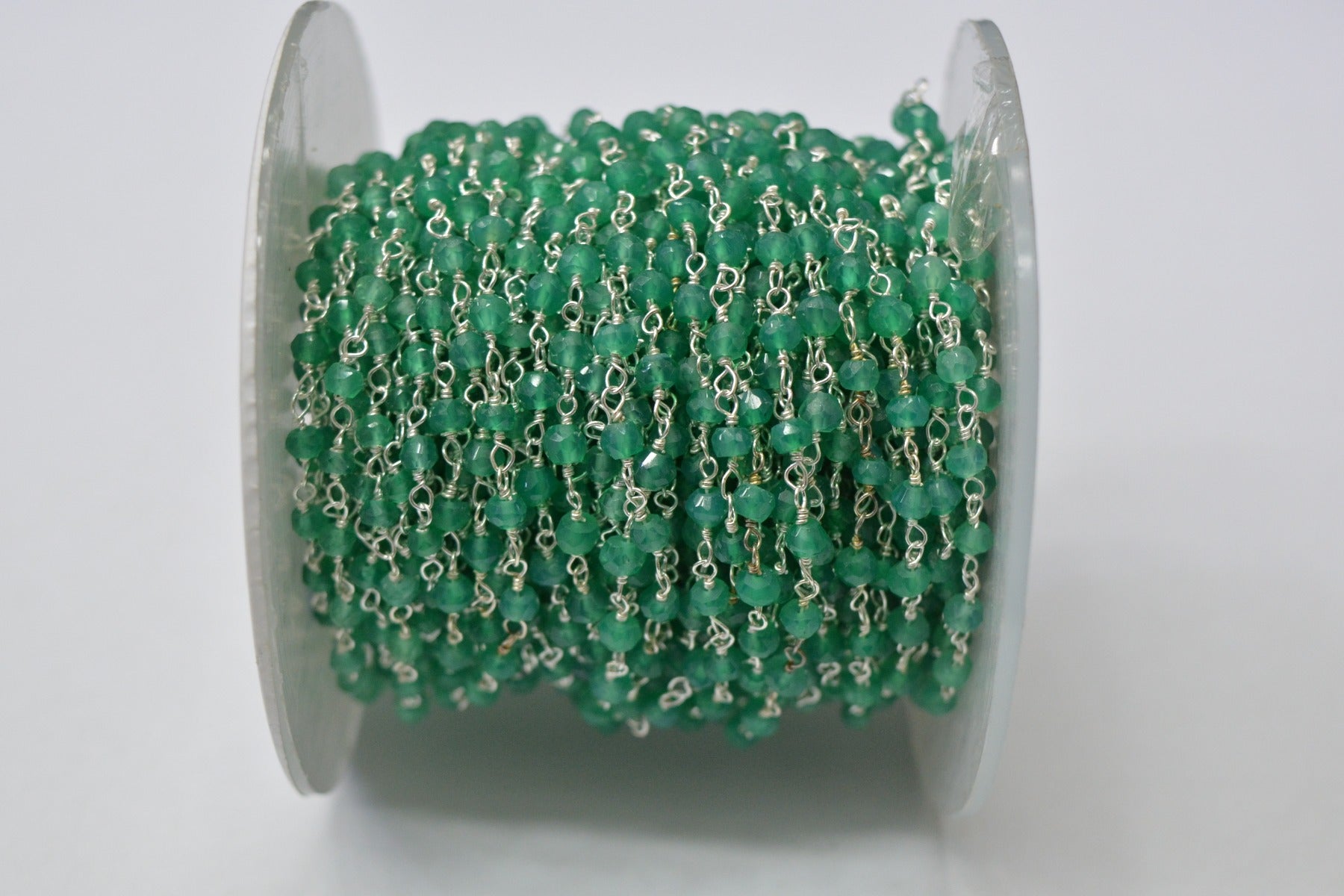 925 Gold Plated Sterling Silver Graceful 3.00 mm Green Onyx Stone Wire Wrapped Rosary Chain. Sold By Foot, ROS2-5584
