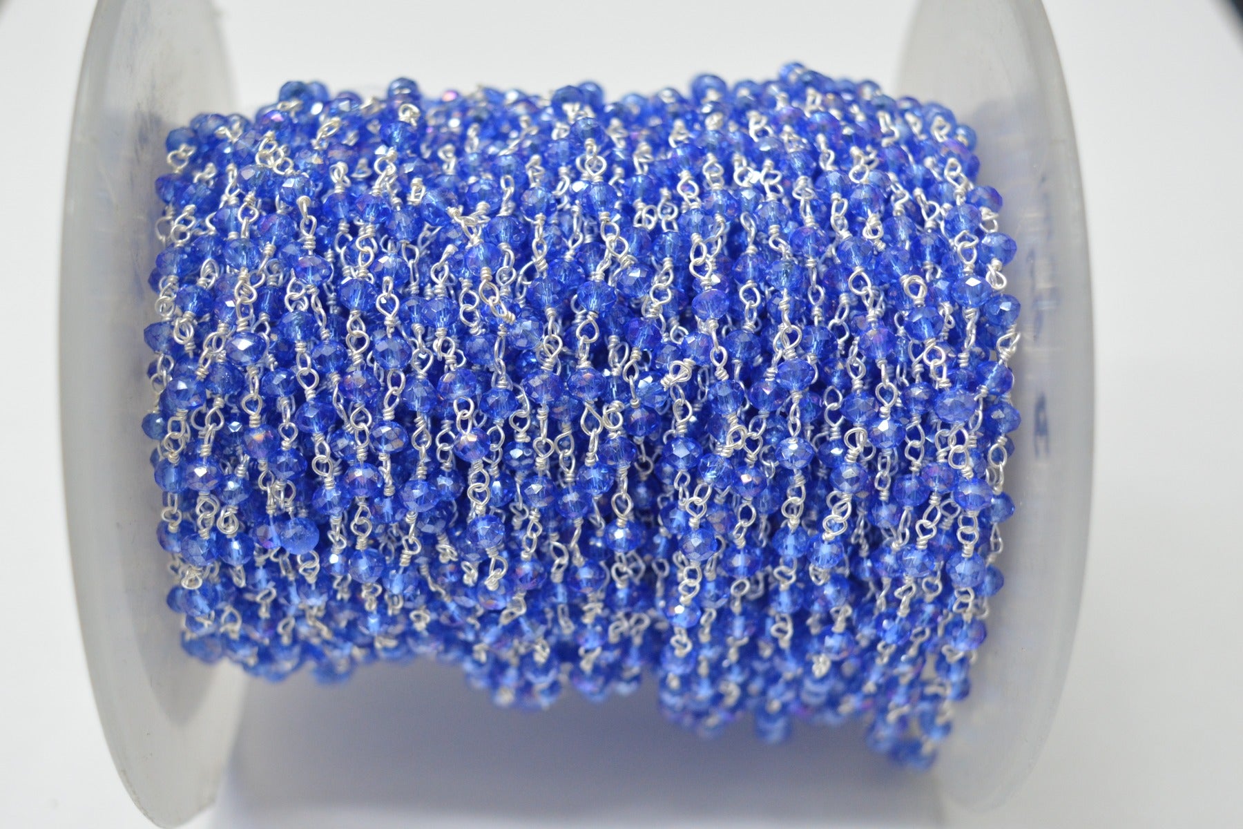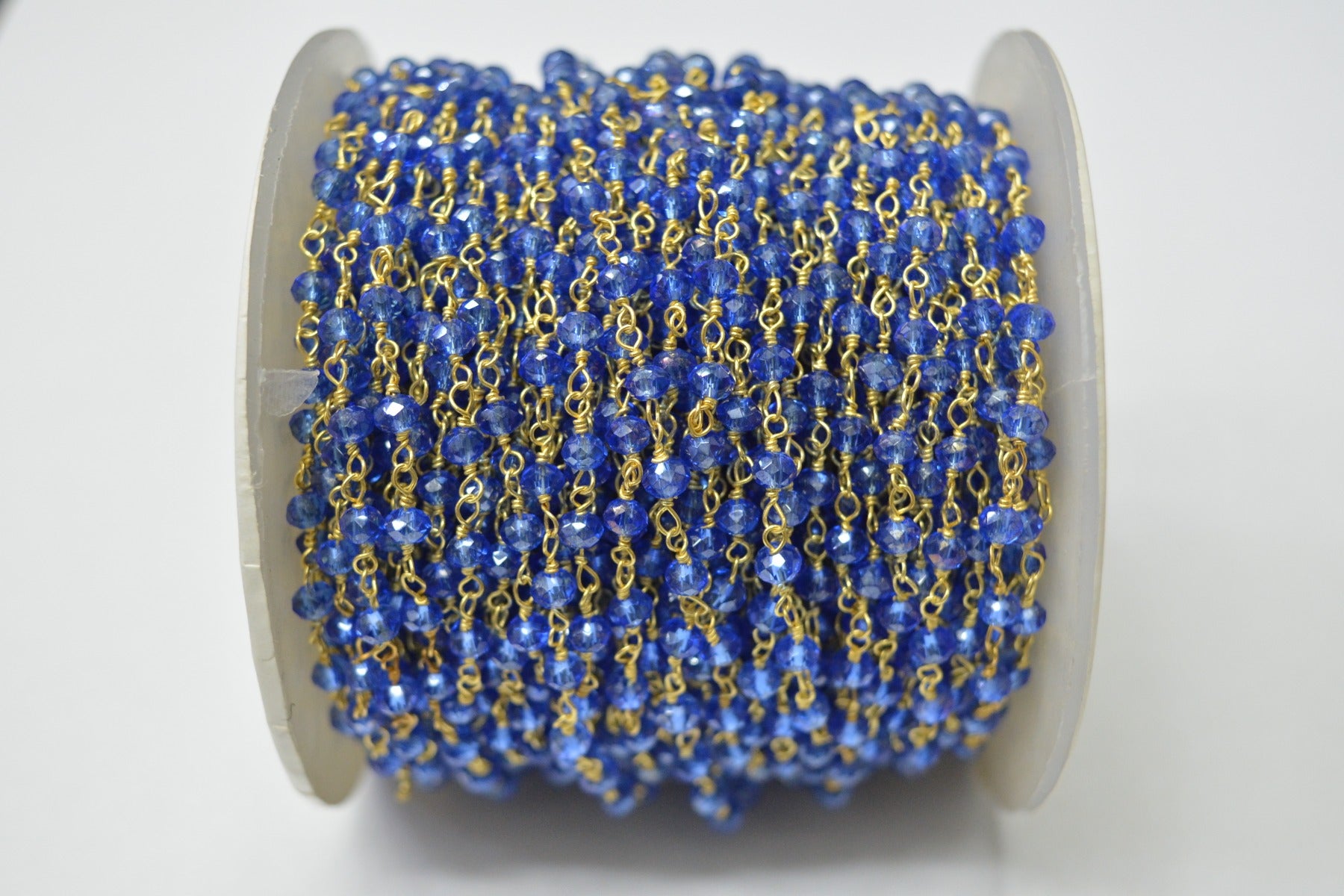 925 Gold Plated Sterling Silver Stunning 3.00 mm Blue Sapphire Stone Wire Wrapped Rosary Chain. Sold By Foot, ROS2-5581