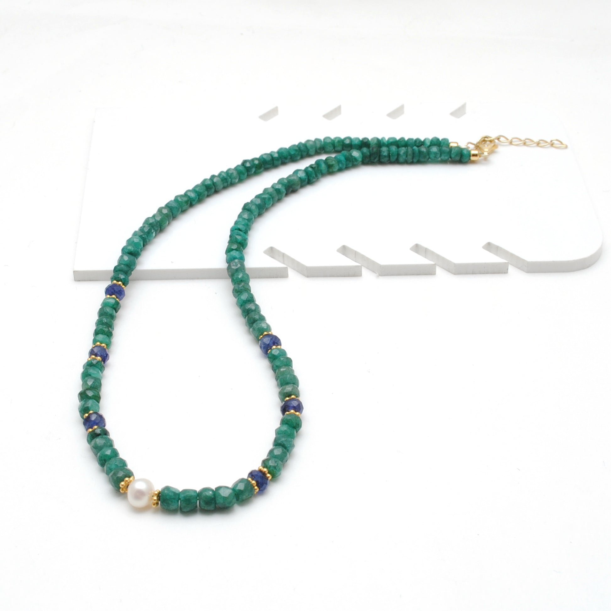 Emerald Rondelle Beads Necklace – 18k Gold Plated with Pearl Beads & Blue Sapphire Accents – 925 Sterling Silver – 18 Inch
