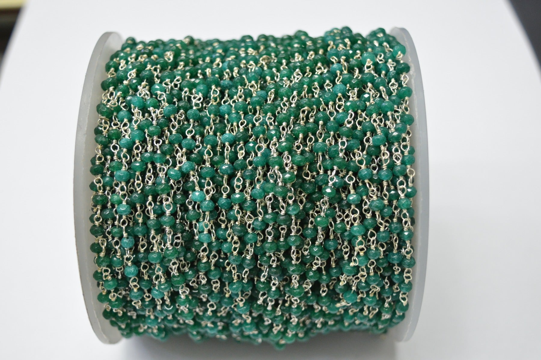 925 Gold Plated Sterling Silver Gorgeous 3.00 mm Emerald Jade Stone Wire Wrapped Rosary Chain. Sold By Foot, ROS2-5563