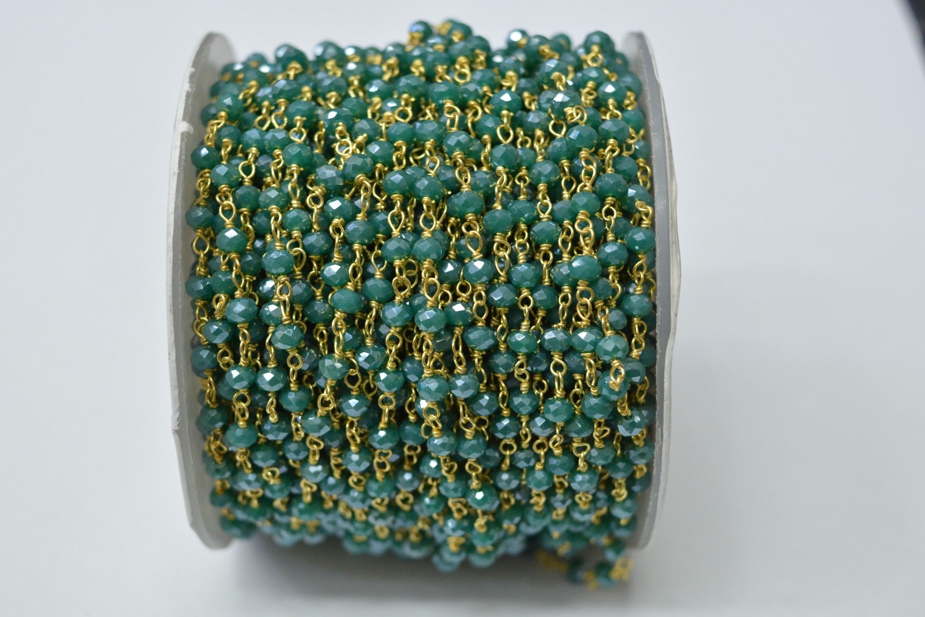 925 Sterling Silver Gold Plated Wonderful Wire Wrapped Roundel Shape 3.00mm Light Green Chalcedony Coated Rosary Chains. Sold By Foot, ROS2-5520
