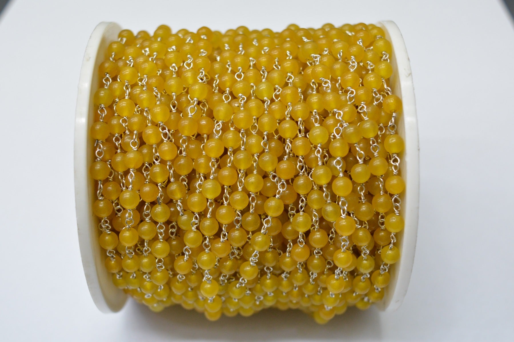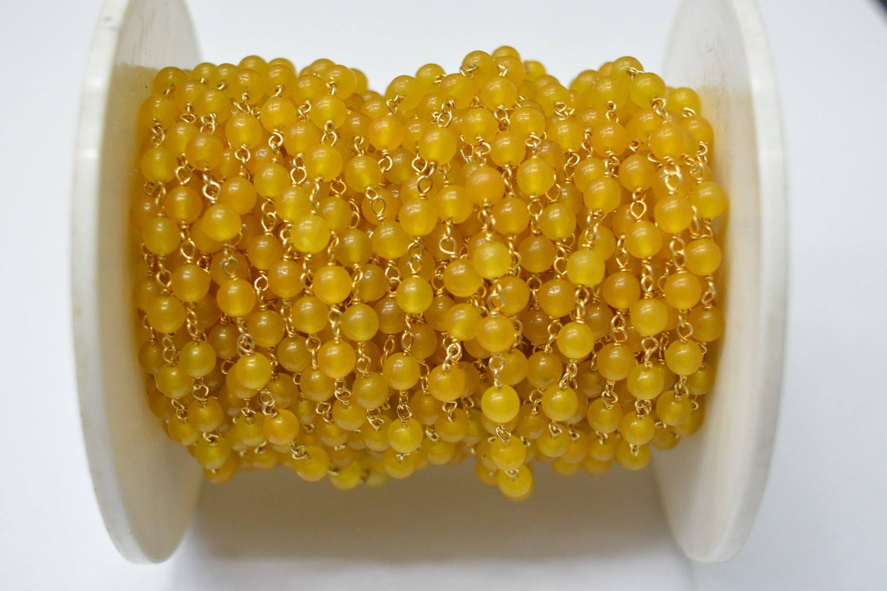 925 Sterling Silver Gold Plated Gorgeous Round Ball Shape 5.00mm Wire Wrapped Rosary Chain With Yellow Chalcedony Stone. Sold By foot, ROS2-5671