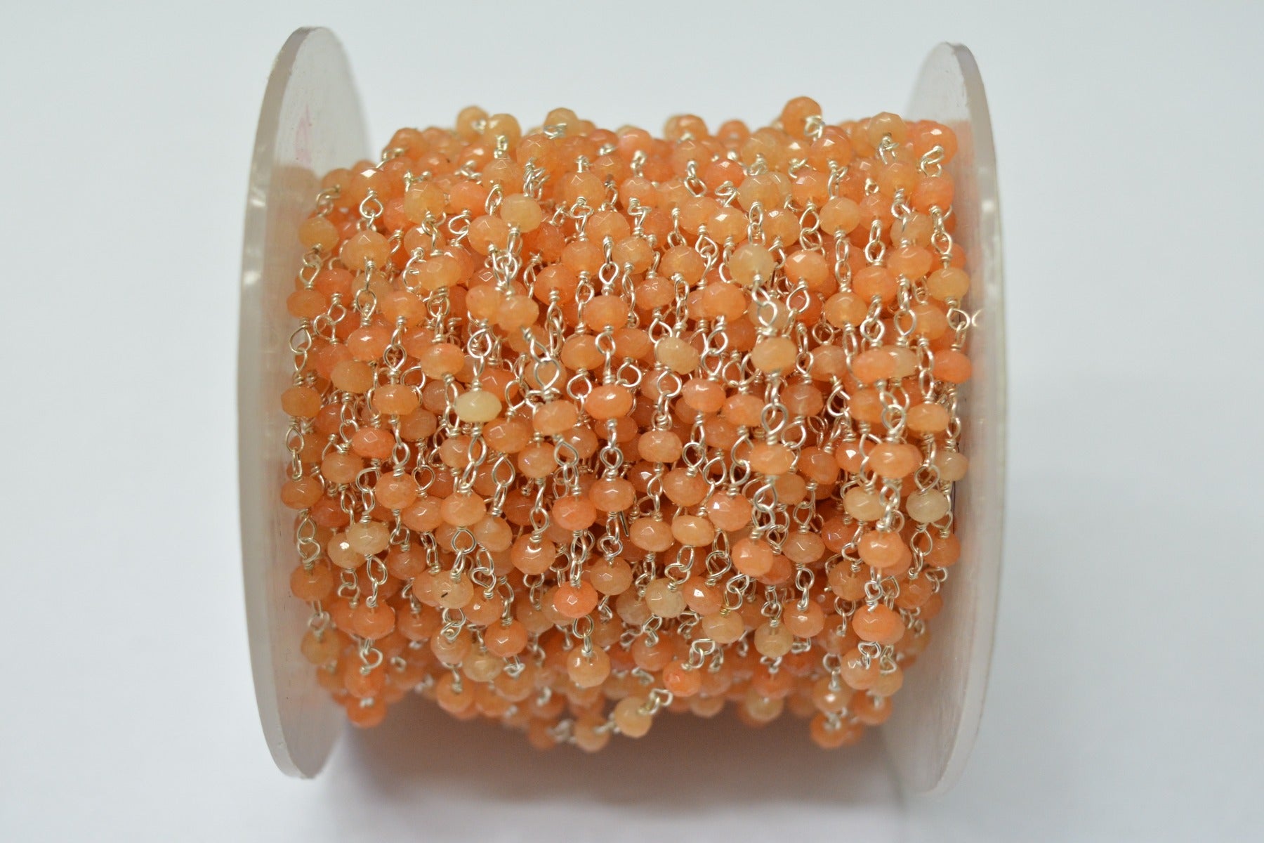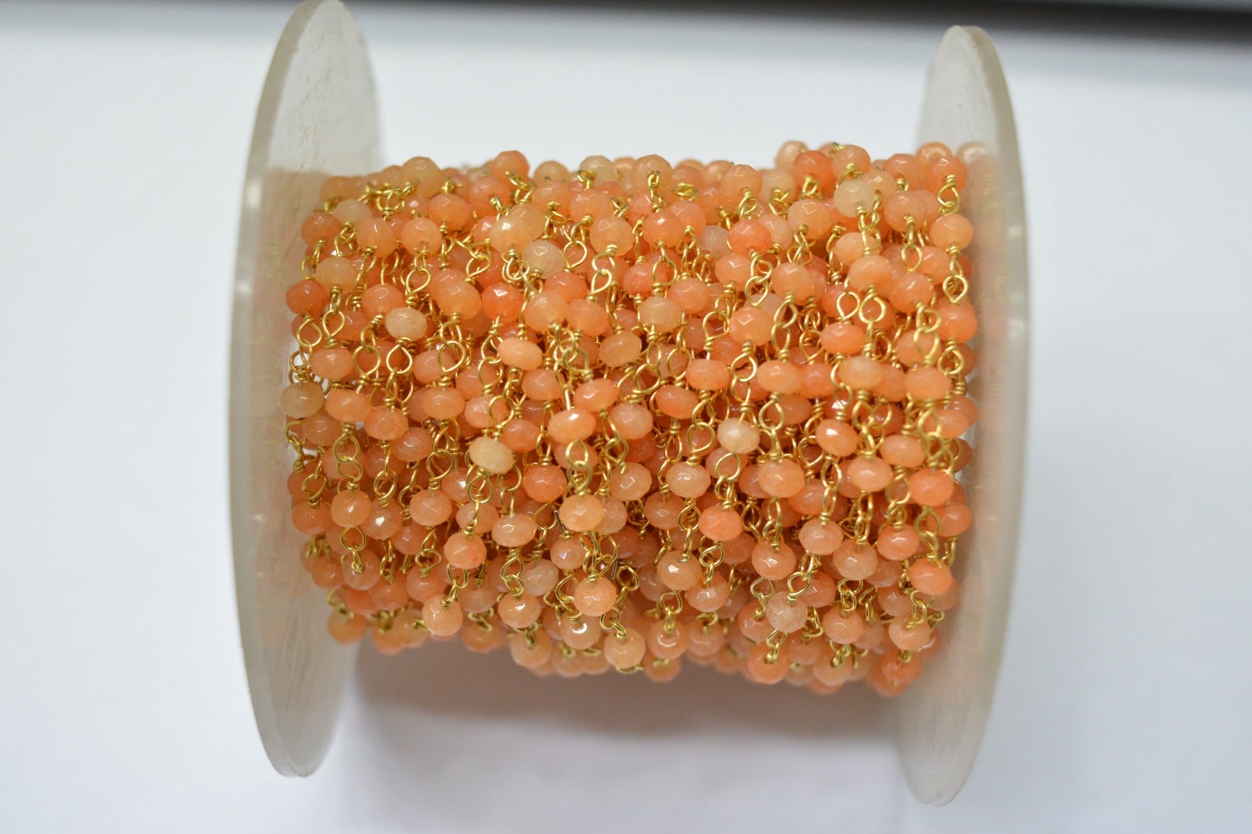 925 Sterling Silver Gold Plated Wire Wrapped Rosary Chain With Roundel Shape 3.00mm Orange Chalcedony Stone. Sold By foot, ROS2-5616