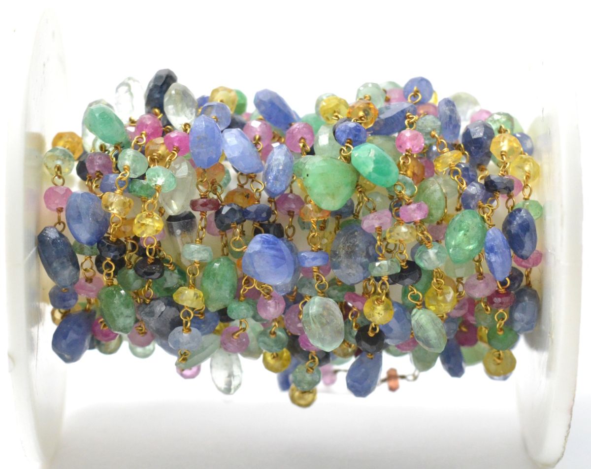 Handmade 14k Solid Gold Rosary Chain in Heart and Roundelle Shape - Multi Sapphire , 6mm - SGGRC-004, Sold By 1 Inch.