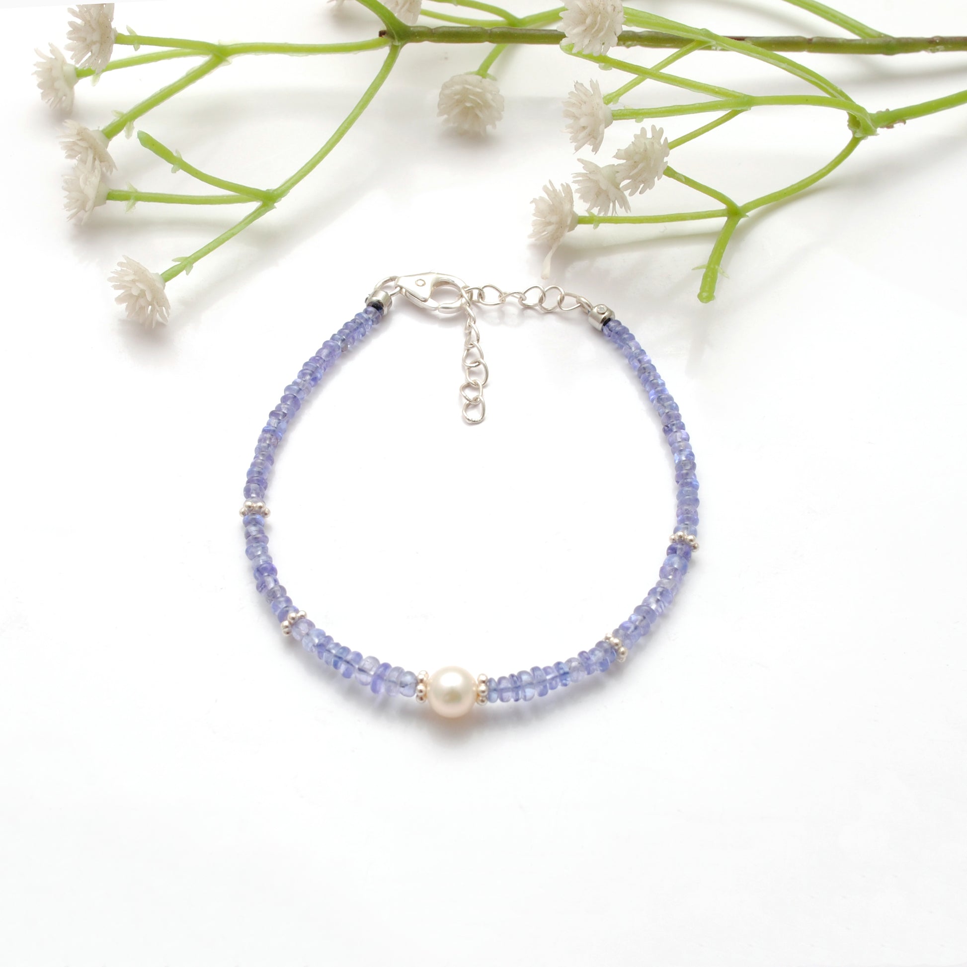 Handmade 8" Natural Tanzanite & Pearl Silver Bracelet