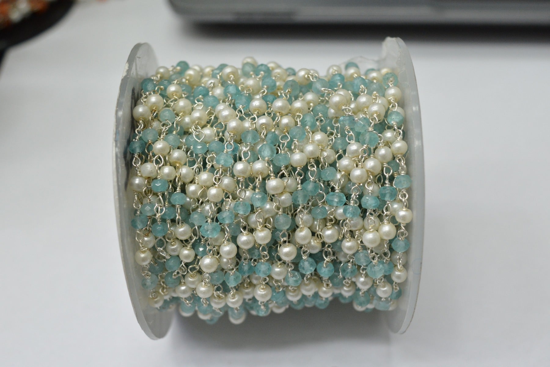 925 Sterling Silver Gold Plated Wonderful Roundel Shape 3.00mm Wire Wrapped Rosary Chain With Apatite + Pearl Stone. Sold By foot, ROS2-5696