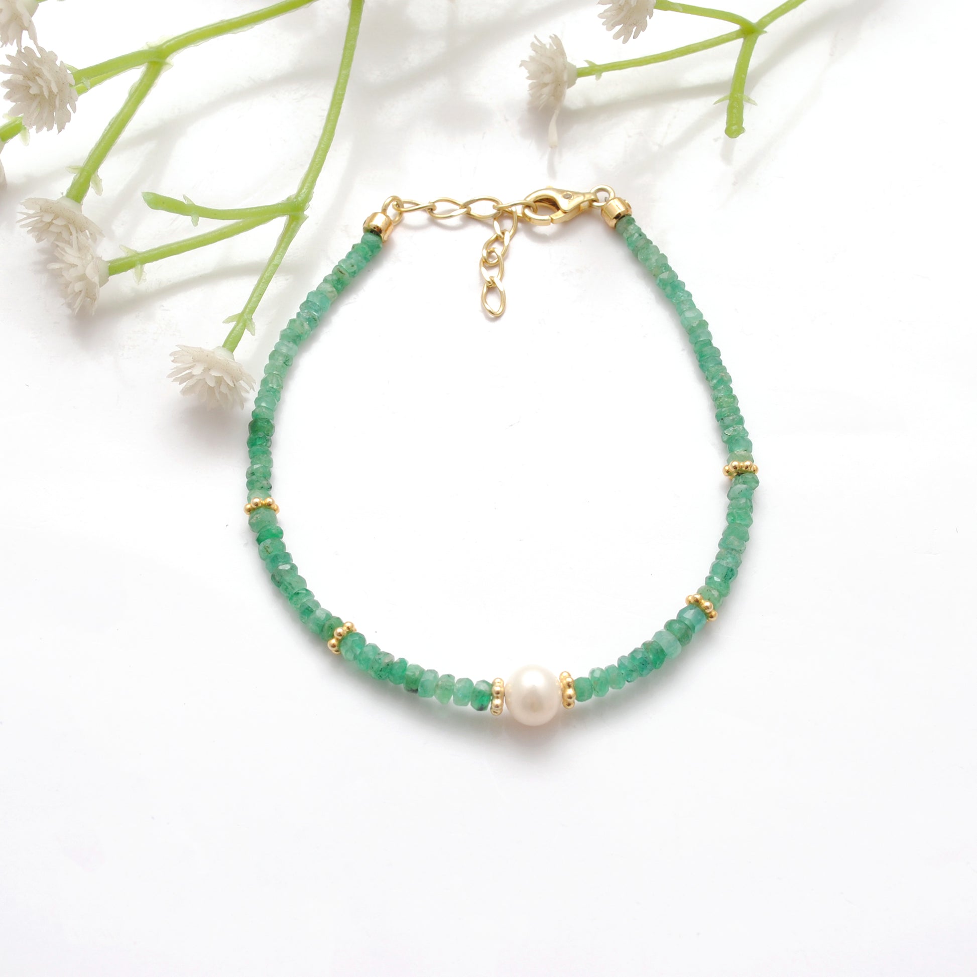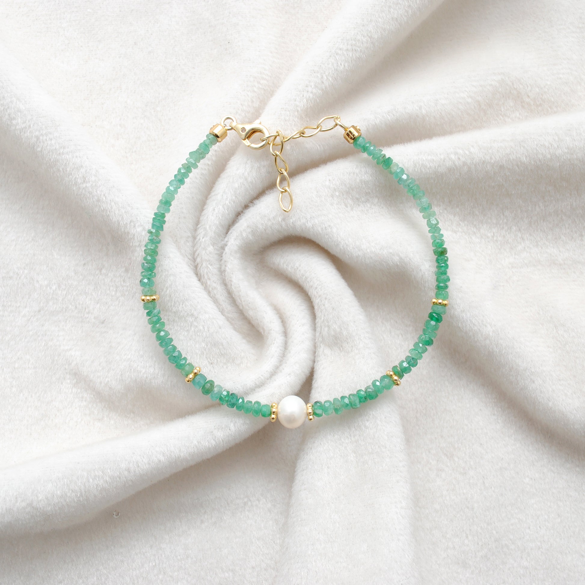 Natural Emerald & Freshwater Pearl Beaded Bracelet — A refined combination of vivid green emeralds and luminous freshwater pearls, expertly handcrafted for everyday elegance and special occasions. This delicate bracelet pairs faceted 3mm emerald rondelles with smooth 6mm round freshwater pearls, accented by warm gold-plated details on high-quality 925 sterling silver for a timeless, versatile look.