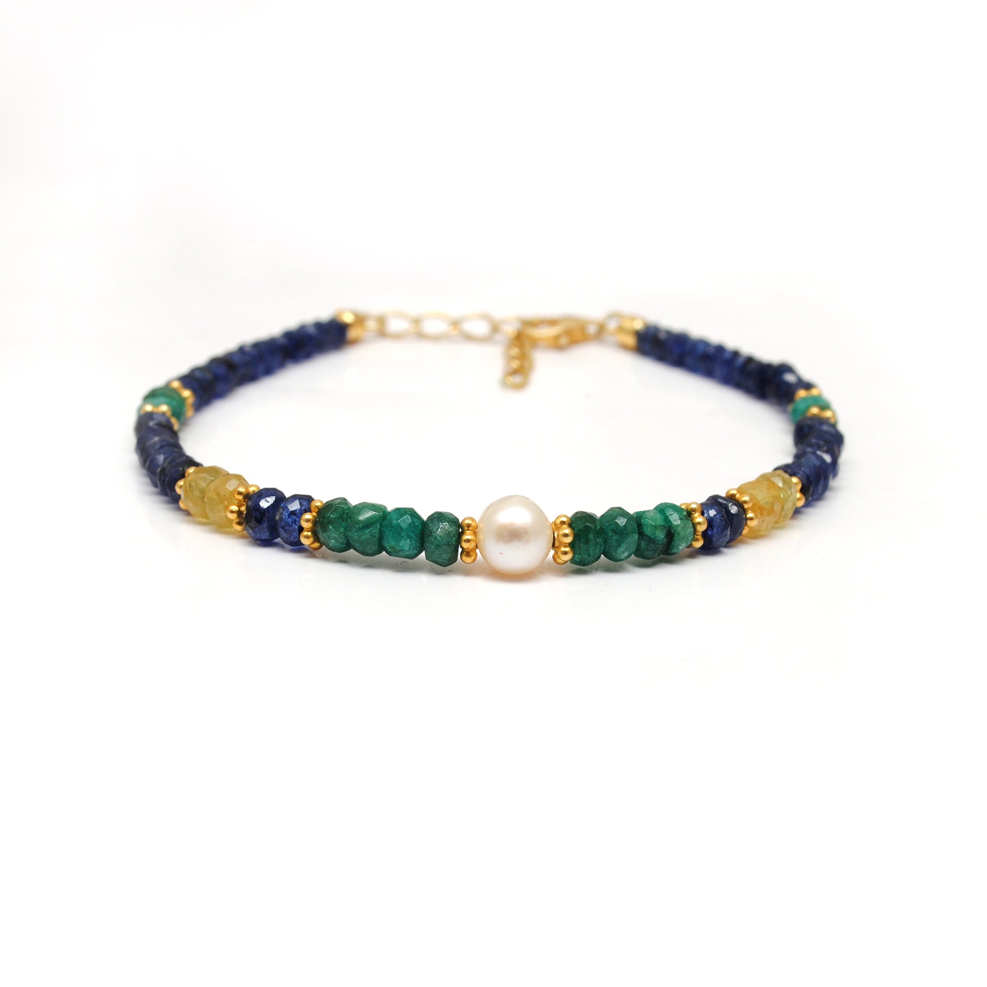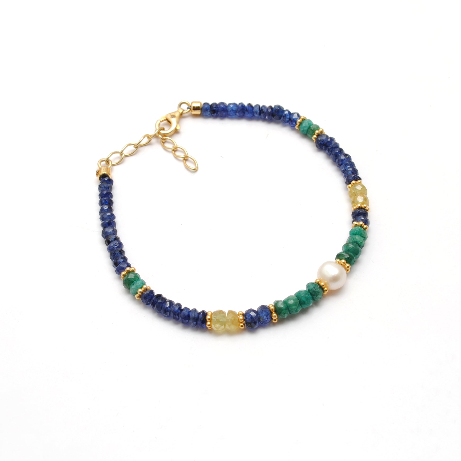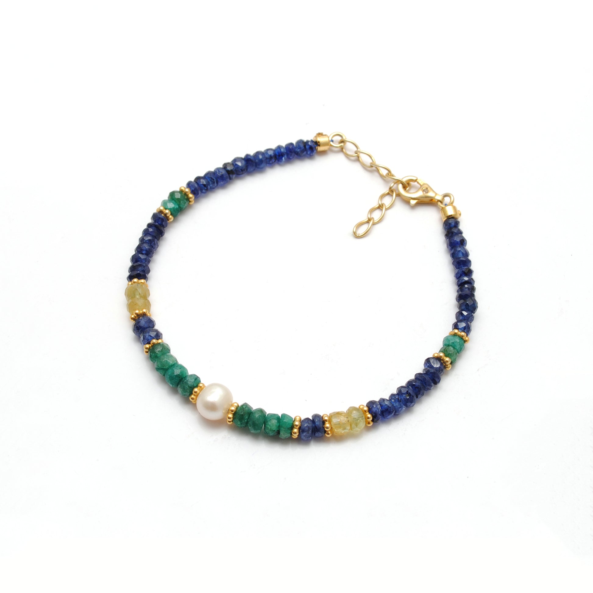 Natural Blue Sapphire, Emerald & Pearl Beaded Bracelet, crafted with 925 Sterling Silver and gold-plated accents. The bracelet features vibrant 4mm Blue Sapphire and Emerald beads paired with lustrous 6mm freshwater pearls, creating a perfect balance of color and sophistication. Completed with a secure lobster clasp, this exquisite design is ideal for both special occasions and everyday elegance.