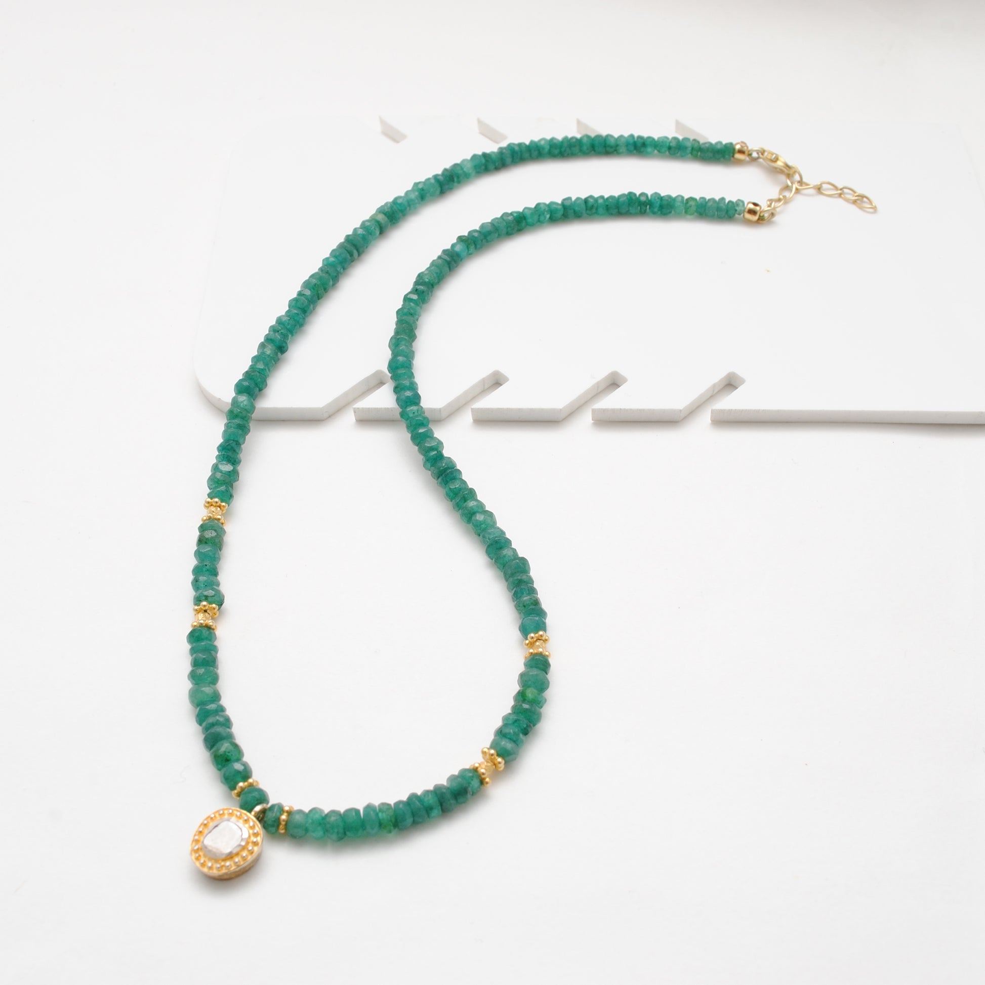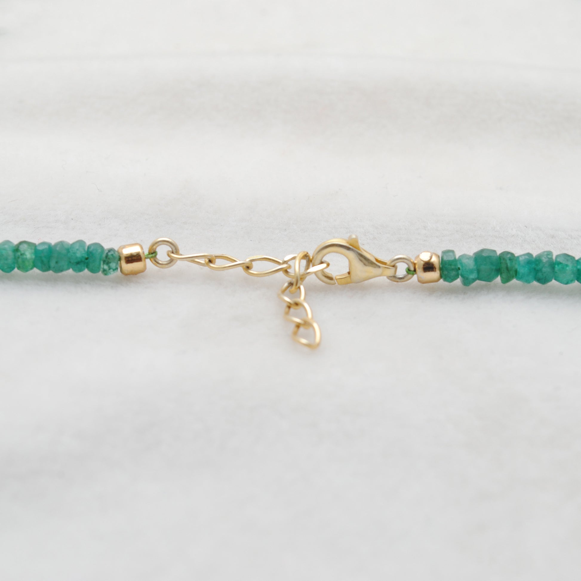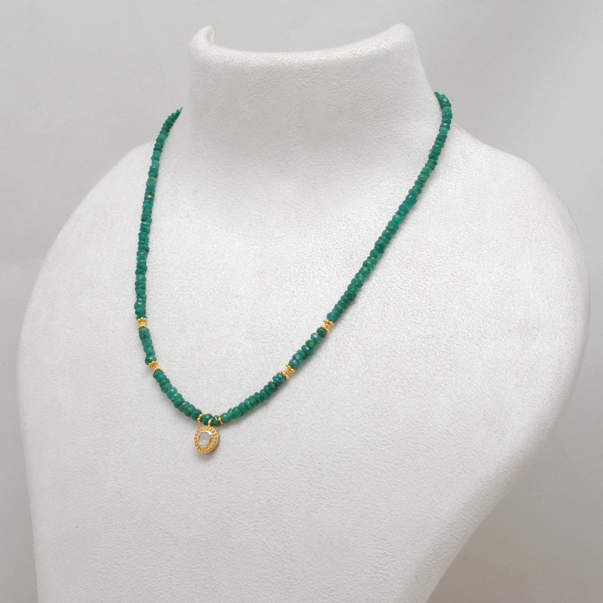 Grace your neckline with the natural elegance of this Emerald Faceted Beads Necklace, a stunning piece handcrafted with genuine emerald gemstones and sparkling rose cut diamonds. Each emerald bead, ranging from 3.5mm to 4.5mm, is meticulously faceted to reflect light beautifully, offering a rich green glow that symbolizes growth, prosperity, and timeless beauty. The shimmering rose cut diamond accent adds a hint of vintage glamour, making this piece an exquisite blend of traditional charm and modern sophistication.