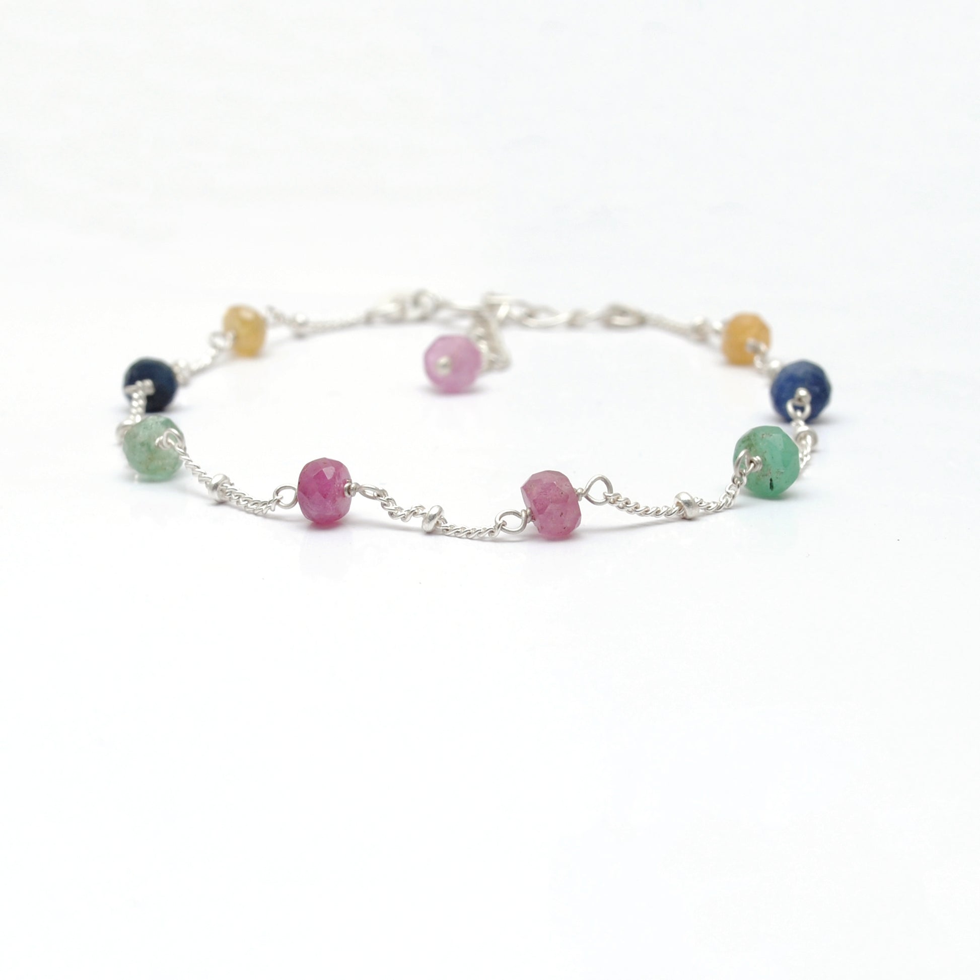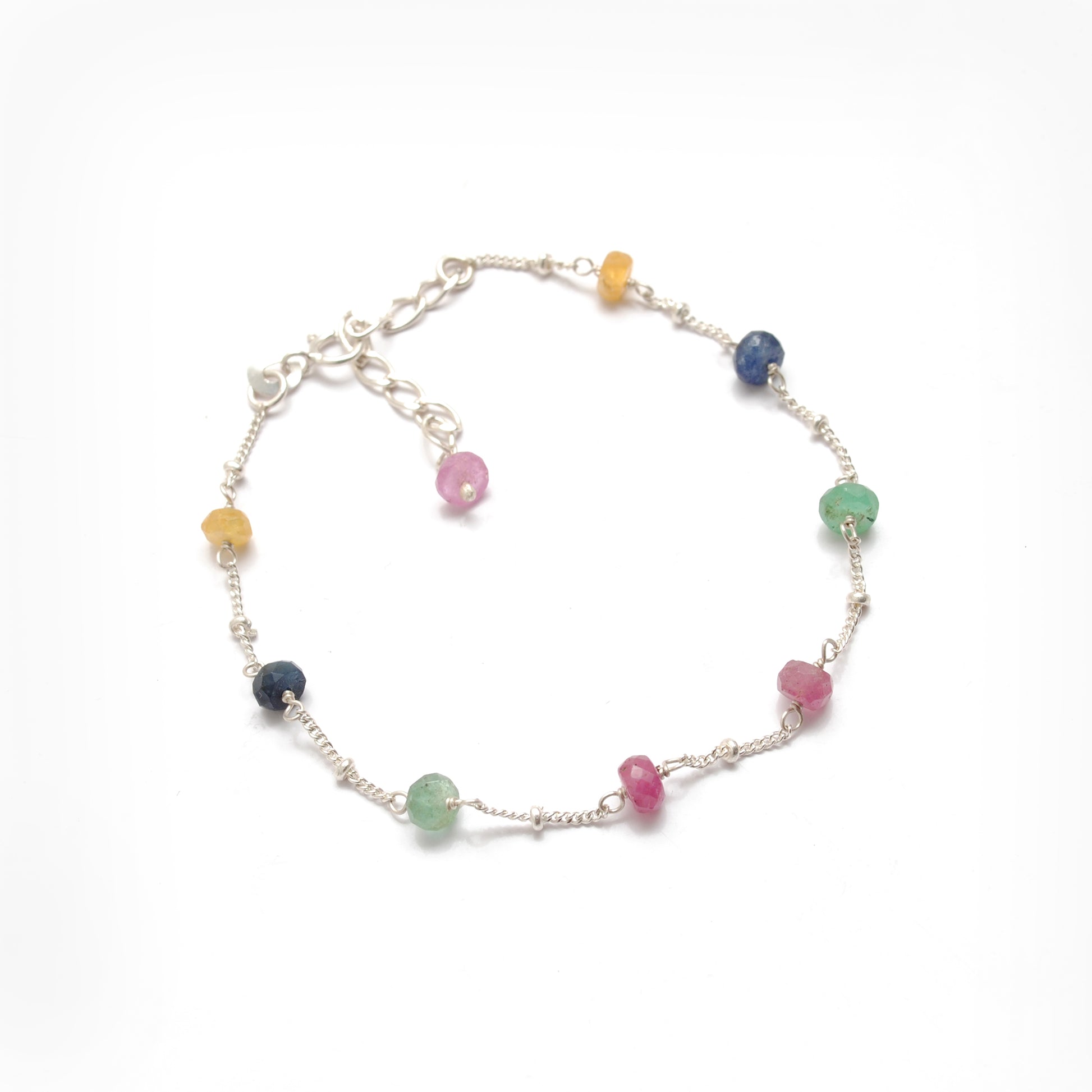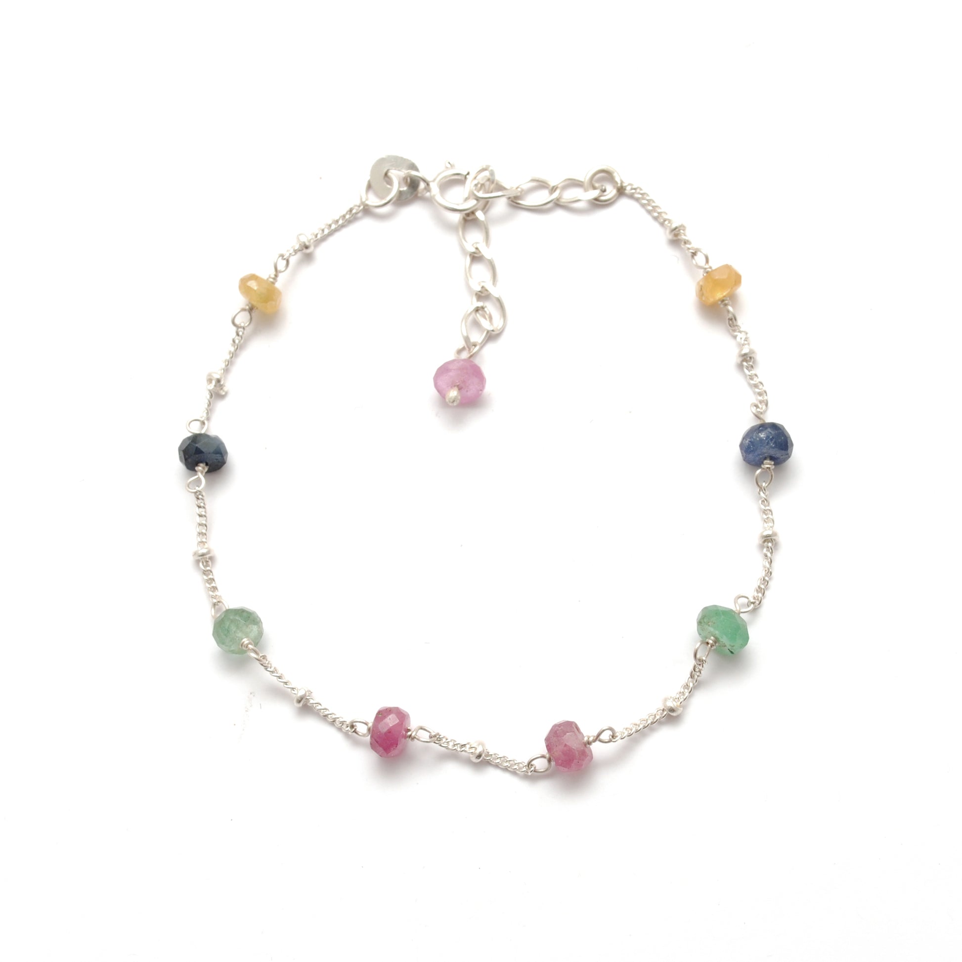 Multi Sapphire Beads with 925 Silver Bracelet. Featuring natural 4mm rondelle Multi Sapphire stones, this bracelet showcases a stunning mix of colors that reflect sophistication and charm. Crafted with fine 925 Sterling Silver, it offers durability and beauty, making it a perfect accessory for everyday wear or special occasions. Lightweight and versatile, it also makes a thoughtful gift for gemstone lovers.