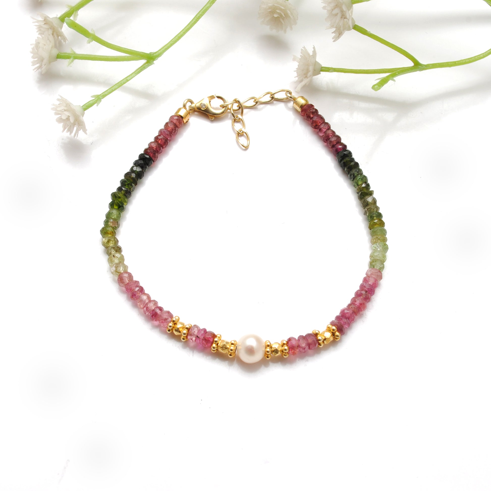 Natural Multi Tourmaline & Freshwater Pearl Beaded Bracelet, beautifully accented with 925 Sterling Silver gold-plated details. Designed with sparkling 4mm faceted rondelle Multi Tourmaline beads and elegant 6mm freshwater pearls, this bracelet blends vibrant color with classic charm. Finished with a secure lobster clasp, it makes a versatile accessory for both daily wear and special occasions.