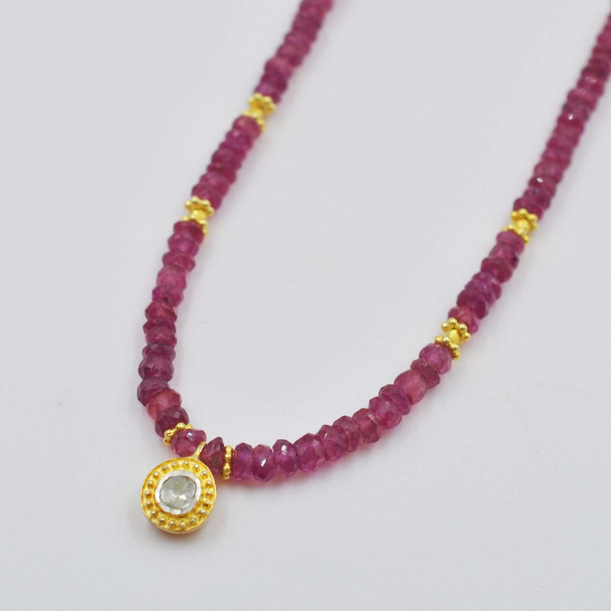 Natural Ruby Beaded Necklace with Polki Flat Cut Diamond Pendant