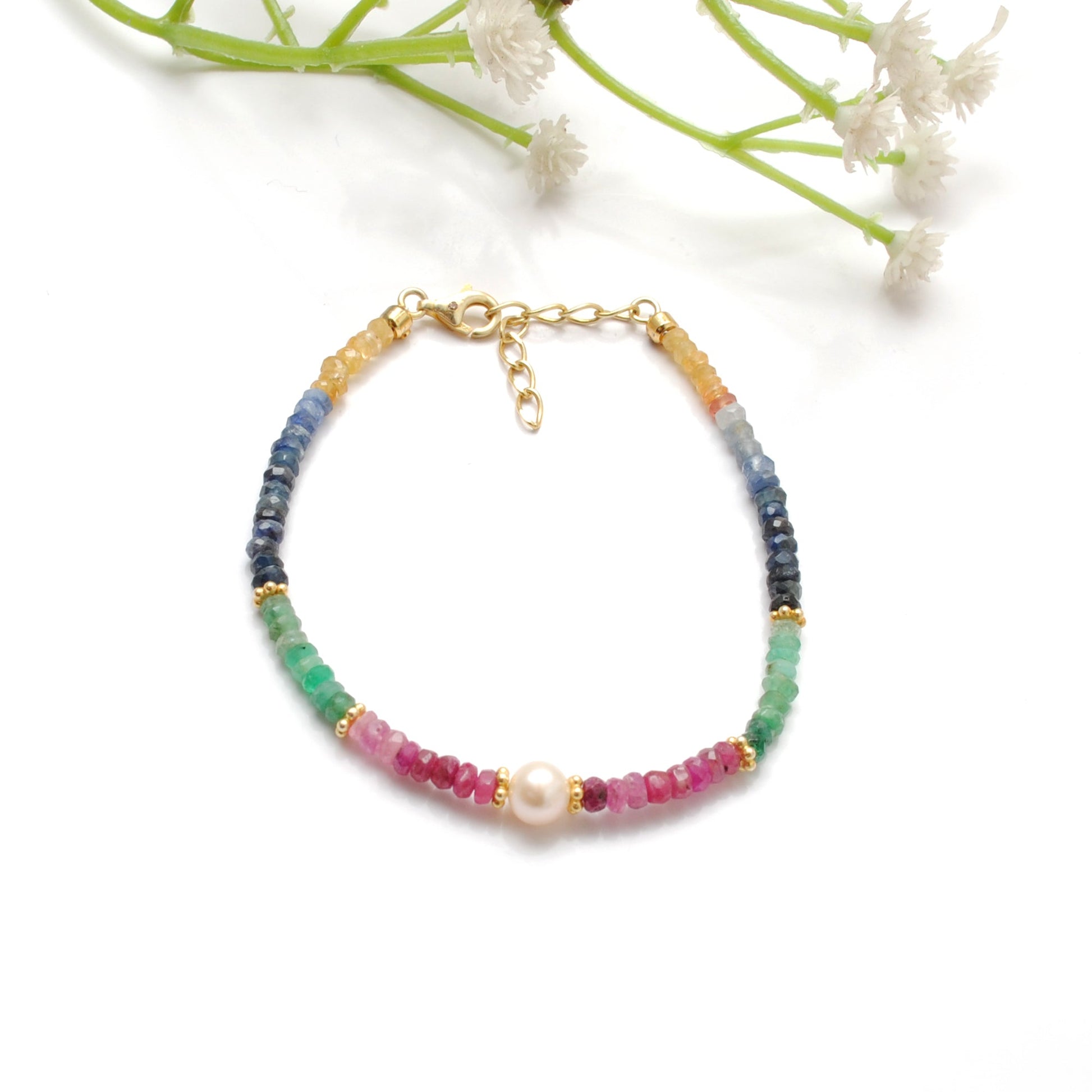 925 Sterling Silver Multi-Gemstone Beaded Bracelet. Ruby Emerald Sapphire