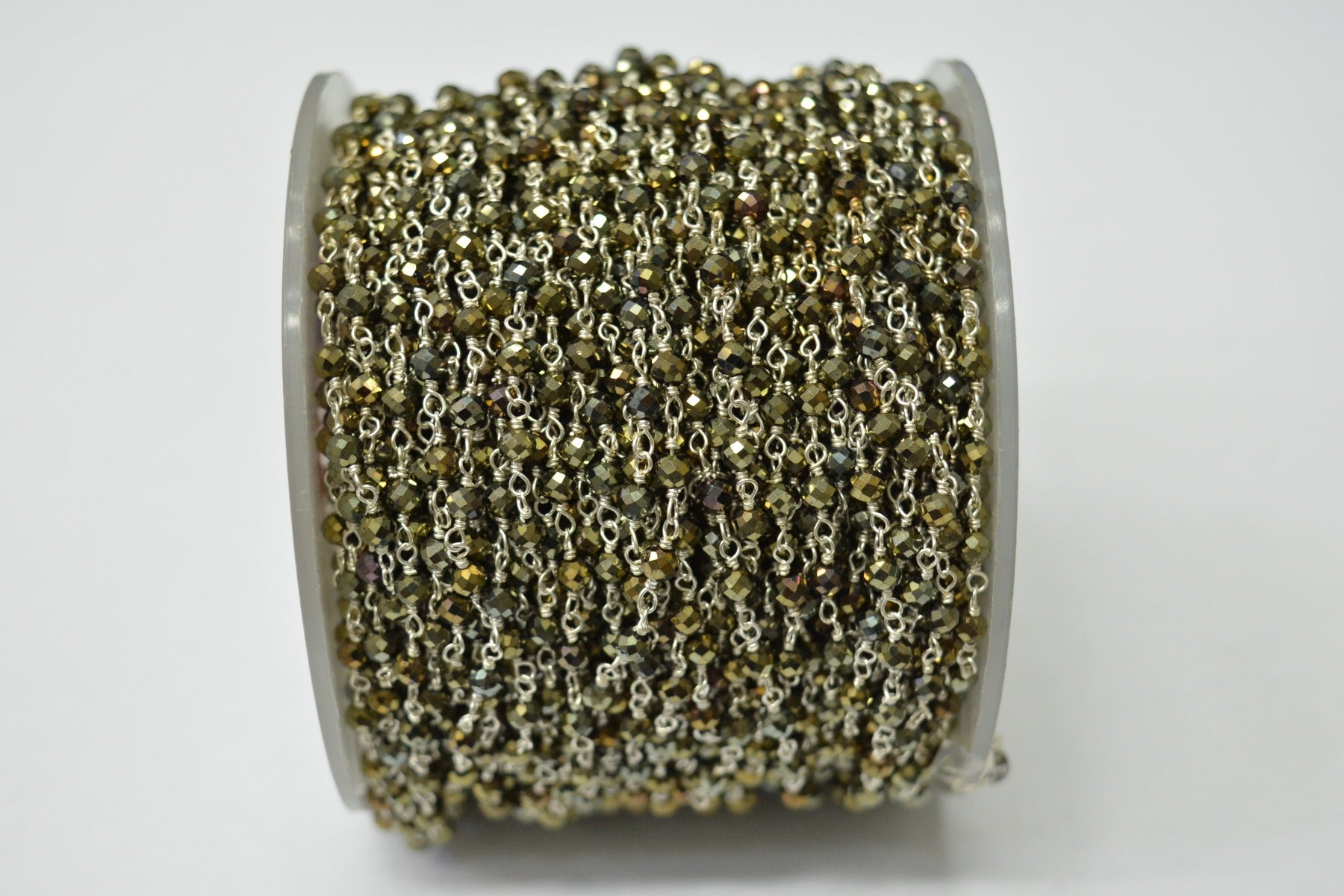925 Sterling Silver Gold Plated Beautiful Wire Wrapped Rosary Chain With Roundel Shape 3.00mm Mystic Brown Coated Stone. Sold By foot, ROS2-5532