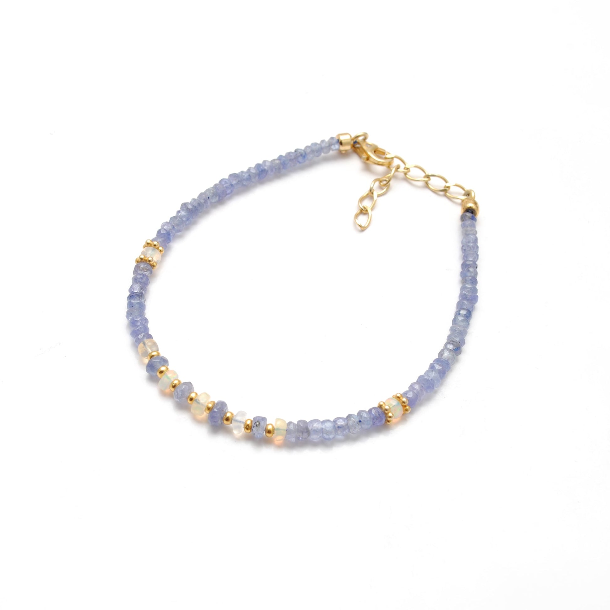 Discover the elegance of this 8-inch silver bracelet, featuring a stunning combination of opal and tanzanite gemstones. The cool tones of opal, known for its ability to calm and soothe, harmonize beautifully with the vibrant purple hues of tanzanite. Perfect for adding a touch of sophistication to any outfit.
